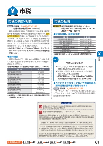 %u7a2e%u3000%u985e %u624b%u2002%u6570%u2002%u6599%u5e02%u770c%u6c11%u7a0e%u6240%u5f97%u30fb%u8ab2%u7a0e%u8a3c%u660e 300%u5186%uff081%u5e74%u5ea61%u4ef6%uff09%u3000%u56fa%u5b9a%u8cc7%u7523%u8a55%u4fa1%u8a3c%u660e 300%u5186%uff081%u5e74%u5ea65%u7b46%uff09%u3000%u56fa%u5b9a%u8cc7%u7523%u516c%u8ab2%u8a3c%u660e 300%u5186%uff081%u5e74%u5ea61%u7b46%uff09%u3000%u7d0d%u7a0e%u8a3c%u660e 300%u5186%uff081%u5e74%u5ea61%u7a0e%u76ee%uff09%u8eca%u691c%u7528%u7d0d%u7a0e%u8a3c%u660e%uff08%u8efd%u81ea%u52d5%u8eca%uff09 %u7121 %u6599%u6ede%u7d0d%u7121%u8a3c%u660e 600%u5186%u4f4f%u5b85%u7528%u5bb6%u5c4b%u8a3c%u660e 1,300%u5186%u25c6%u0007%u30b3%u30f3%u30d3%u30cb%u30a8%u30f3%u30b9%u30b9%u30c8%u30a2%u306a%u3069%u3067%u5e02%u770c%u6c11%u7a0e%u306e%u6240%u5f97%uff08%u8ab2%u7a0e%uff09%u8a3c%u660e%u66f8%u304c%u53d6%u5f97%u3067%u304d%u307e%u3059%u554f%u5408%u305b %u7a0e%u5236%u8ab2%u3000%u260e 086-803-1166%u3000%u30de%u30a4%u30ca%u30f3%u30d0%uff0d%u30ab%uff0d%u30c9%u3092%u5229%u7528%u3057%u3066%u3001%u30b3%u30f3%u30d3%u30cb%u30a8%u30f3%u30b9%u30b9%u30c8%u30a2%u3084%u30a4%u30aa%u30f3%u3001%u30de%u30eb%u30ca%u30ab%u306a%u3069%u3067%u5e02%u770c%u6c11%u7a0e%u306e%u6240%u5f97%uff08%u8ab2%u7a0e%uff09%u8a3c%u660e%u66f8%u3092%u53d6%u5f97%u3067%u304d%u307e%u3059%u3002%u25c6%u8a3c%u660e%u306e%u7a2e%u985e%u3068%u624b%u6570%u6599%uff081%u4ef6%uff09%u203b%u0007%u7d0d%u671f%u9650%u304c%u571f%u30fb%u65e5%u66dc%u3001%u795d%u65e5%u306e%u5834%u5408%u306f%u3001%u305d%u306e%u65e5%u4ee5%u964d%u306e%u6700%u521d%u306e%u5e73%u65e5%u304c%u7d0d%u671f%u9650%u3068%u306a%u308a%u307e%u3059%u3002%u7a0e%u3000%u76ee %u7d0d%u2002%u671f%u2002%u9650%u56fa%u5b9a%u8cc7%u7523%u7a0e%uff08%u7b2c1%u671f%uff09 4%u670830%u65e5%u8efd%u81ea%u52d5%u8eca%u7a0e%uff08%u7a2e%u5225%u5272%uff09 5%u670831%u65e5%u5e02%u770c%u6c11%u7a0e%uff08%u7b2c1%u671f%uff09 6%u670830%u65e5%u56fa%u5b9a%u8cc7%u7523%u7a0e%uff08%u7b2c2%u671f%uff09 7%u670831%u65e5%u5e02%u770c%u6c11%u7a0e%uff08%u7b2c2%u671f%uff09 8%u670831%u65e5%u56fa%u5b9a%u8cc7%u7523%u7a0e%uff08%u7b2c3%u671f%uff09 9%u670830%u65e5%u5e02%u770c%u6c11%u7a0e%uff08%u7b2c3%u671f%uff09 10%u670831%u65e5%u56fa%u5b9a%u8cc7%u7523%u7a0e%uff08%u7b2c4%u671f%uff09 12%u670825%u65e5%u5e02%u770c%u6c11%u7a0e%uff08%u7b2c4%u671f%uff09 %u7fcc%u5e741%u670831%u65e5%u3000%u8efd%u81ea%u52d5%u8eca%u7a0e%uff08%u7a2e%u5225%u5272%uff09%u3001%u56fa%u5b9a%u8cc7%u7523%u7a0e%uff08%u571f%u5730%u30fb%u5bb6%u5c4b%u30fb%u511f%u5374%u8cc7%u7523%uff09%u30fb%u90fd%u5e02%u8a08%u753b%u7a0e%u3001%u5e02%u770c%u6c11%u7a0e%uff08%u666e%u901a%u5fb4%u53ce%uff09%u306e%u7d0d%u4ed8%u306b%u306f%u3001%u4fbf%u5229%u306a%u53e3%u5ea7%u632f%u66ff%u7d0d%u4ed8%u306e%u307b%u304b%u3001%u5730%u65b9%u7a0e%u304a%u652f%u6255%u30b5%u30a4%u30c8%u3067%u306e%u7d0d%u4ed8%u3001%u30b9%u30de%u30fc%u30c8%u30d5%u30a9%u30f3%u6c7a%u6e08%u30a2%u30d7%u30ea%u306b%u3088%u308b%u7d0d%u4ed8%u3001%u91d1%u878d%u6a5f%u95a2%u306e%u5e97%u8217%u7a93%u53e3%u30fb%u30b3%u30f3%u30d3%u30cb%u30a8%u30f3%u30b9%u30b9%u30c8%u30a2%u3067%u306e%u7d0d%u4ed8%u306a%u3069%u304c%u5229%u7528%u3067%u304d%u307e%u3059%u3002%u8a73%u3057%u304f%u306f%u5ca1%u5c71%u5e02%u306e%u30db%u30fc%u30e0%u30da%u30fc%u30b8%u3084%u7d0d%u7a0e%u901a%u77e5%u66f8%u306b%u540c%u5c01%u306e%u30ea%u30fc%u30d5%u30ec%u30c3%u30c8%u3092%u3054%u89a7%u304f%u3060%u3055%u3044%u3002%u203b%u0007%u5730%u65b9%u7a0e%u304a%u652f%u6255%u30b5%u30a4%u30c8%u3067%u306e%u7d0d%u4ed8%u306e%u5834%u5408%u306f%u3001%u30af%u30ec%u30b8%u30c3%u30c8%u30ab%u30fc%u30c9%u3084%u30a4%u30f3%u30bf%u30fc%u30cd%u30c3%u30c8%u30d0%u30f3%u30ad%u30f3%u30b0%u306a%u3069%u306e%u7d0d%u4ed8%u65b9%u6cd5%u304c%u9078%u3079%u307e%u3059%u3002%u25c6%u7d0d%u4ed8%u76f8%u8ac7%u3000%u7d4c%u6e08%u7684%u7406%u7531%u306a%u3069%u3067%u4e00%u5ea6%u306b%u7d0d%u4ed8%u304c%u56f0%u96e3%u306a%u3068%u304d%u306f%u3001%u5206%u5272%u3057%u3066%u7d0d%u3081%u308b%u65b9%u6cd5%u306a%u3069%u3082%u3042%u308a%u307e%u3059%u306e%u3067%u3001%u65e9%u3081%u306b%u53ce%u7d0d%u8ab2%u306b%u76f8%u8ac7%u3057%u3066%u304f%u3060%u3055%u3044%u3002%uff08%u5404%u533a%u5e02%u7a0e%u4e8b%u52d9%u6240%u3067%u306f%u5206%u5272%u7d0d%u4ed8%u306e%u76f8%u8ac7%u306f%u53d7%u4ed8%u3057%u3066%u3044%u307e%u305b%u3093%uff09%u203b%u0007%u304a%u652f%u6255%u3044%u306f%u30ad%u30e3%u30c3%u30b7%u30e5%u30ec%u30b9%u6c7a%u6e08%u3082%u5229%u7528%u53ef%u80fd%u3067%u3059%u3002%u5e02%u7a0e%u306e%u7d0d%u4ed8%u30fb%u76f8%u8ac7 %u5e02%u7a0e%u306e%u8a3c%u660e%u53ce%u7d0d%u8ab2%u3000%u260e 086-803-1186%u5404%u533a%u5e02%u7a0e%u4e8b%u52d9%u6240%uff08%u27a1P42%uff5e49%u53c2%u7167%uff09%u554f%u5408%u305b%u7533%u8acb%u306b%u5fc5%u8981%u306a%u3082%u306e%u0007%u672c%u4eba%u304c%u7a93%u53e3%u306b%u6765%u308b%u3068%u304d%u306f%u8acb%u6c42%u8005%u306e%u672c%u4eba%u78ba%u8a8d%u66f8%u985e%uff08%u904b%u8ee2%u514d%u8a31%u8a3c%u3001%u5065%u5eb7%u4fdd%u967a%u8a3c%u306a%u3069%uff09%u0007%u4ee3%u7406%u4eba%u304c%u7a93%u53e3%u306b%u6765%u308b%u3068%u304d%u306f%u672c%u4eba%u304b%u3089%u306e%u59d4%u4efb%u72b6%u3068%u4ee3%u7406%u4eba%u306e%u672c%u4eba%u78ba%u8a8d%u66f8%u985e%u203b%u0007%u8a3c%u660e%u306e%u7a2e%u985e%u306b%u3088%u3063%u3066%u306f%u3001%u8acb%u6c42%u5185%u5bb9%u306a%u3069%u306e%u78ba%u8a8d%u306e%u305f%u3081%u6839%u62e0%u8cc7%u6599%u306e%u63d0%u793a%u3092%u6c42%u3081%u308b%u3053%u3068%u304c%u3042%u308a%u307e%u3059%u3002%u5e02%u7a0e%u5404%u533a%u5e02%u7a0e%u4e8b%u52d9%u6240%u3001%u5404%u652f%u6240%u30fb%u5730%u57df%u30bb%u30f3%u30bf%u30fc%u30fb%u5e02%u6c11%u30b5%u30fc%u30d3%u30b9%u30bb%u30f3%u30bf%u30fc%u30fb%u5e02%u6c11%u30b5%u30fc%u30d3%u30b9%u30b3%u30fc%u30ca%u30fc%u30fb%u9023%u7d61%u6240%uff08%u27a1P42%uff5e49%u53c2%u7167%uff09%u53d6%u6271%u7a93%u53e3%u3088%u304f%u3042%u308b%u8cea%u554f%u5bb6%u5c4b%u306e%u8a55%u4fa1%u306f%u518d%u5efa%u7bc9%u4fa1%u683c%u65b9%u5f0f%u306b%u3088%u308b%u3082%u306e%u3068%u3055%u308c%u3066%u3044%u307e%u3059%u3002%u5177%u4f53%u7684%u306b%u306f%u3001%u8a55%u4fa1%u306e%u5bfe%u8c61%u3068%u306a%u3063%u305f%u5bb6%u5c4b%u3068%u540c%u4e00%u306e%u3082%u306e%u3092%u8a55%u4fa1%u66ff%u3048%u6642%u70b9%u306b%u304a%u3044%u3066%u3001%u305d%u306e%u5834%u6240%u306b%u65b0%u7bc9%u3