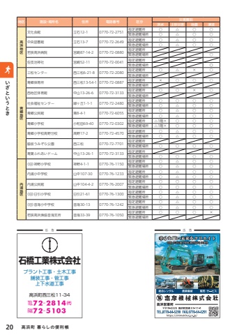 %u5730%u533a %u65bd%u8a2d%u30fb%u5834%u6240%u540d %u4f4f%u6240 %u96fb%u8a71%u756a%u53f7 %u533a%u5206 %u707d%u5bb3%u7a2e%u5225%u6d2a%u6c34 %u571f%u7802%u707d%u5bb3 %u5730%u9707 %u6d25%u6ce2%u9ad8%u6d5c%u5730%u533a%u6587%u5316%u4f1a%u9928 %u7acb%u77f312-1 0770-72-2751 %u6307%u5b9a%u907f%u96e3%u6240 %u25cb %u25b3 %u25cb %u25cb%u7dca%u6025%u907f%u96e3%u5834%u6240 %u25cb %u25b3 %u25cb %u25cb%u4e2d%u592e%u56f3%u66f8%u9928 %u7acb%u77f313-7 0770-72-2649 %u6307%u5b9a%u907f%u96e3%u6240 %u25cb %u25b3 %u25cb %u25cb%u7dca%u6025%u907f%u96e3%u5834%u6240 %u25cb %u25b3 %u25cb %u25cb%u82e5%u72ed%u9ad8%u6d5c%u75c5%u9662 %u5bae%u5d0e87-14-2 0770-72-0880 %u6307%u5b9a%u907f%u96e3%u6240%u7dca%u6025%u907f%u96e3%u5834%u6240 %u25cb%u4f50%u4f0e%u6cbb%u795e%u793e %u5bae%u5d0e52-11 0770-72-0041 %u6307%u5b9a%u907f%u96e3%u6240%u7dca%u6025%u907f%u96e3%u5834%u6240 %u3007%u9752%u90f7%u5730%u533a%u4e09%u677e%u30bb%u30f3%u30bf%u30fc %u897f%u4e09%u677e6-21-8 0770-72-2080 %u6307%u5b9a%u907f%u96e3%u6240 %u25cb %u25b3 %u00d7 %u25cb%u7dca%u6025%u907f%u96e3%u5834%u6240%u9752%u90f7%u4fdd%u80b2%u6240 %u897f%u4e09%u677e13-54-1 0770-72-0887 %u6307%u5b9a%u907f%u96e3%u6240 %u00d7 %u25cb %u25cb %u25cb%u7dca%u6025%u907f%u96e3%u5834%u6240%u897f%u5730%u533a%u4f53%u80b2%u9928 %u4e2d%u5c7113-26-6 0770-72-3133 %u6307%u5b9a%u907f%u96e3%u6240 %u25cb %u25cb %u00d7 %u25cb%u7dca%u6025%u907f%u96e3%u5834%u6240%u793e%u4f1a%u798f%u7949%u30bb%u30f3%u30bf%u30fc %u7dd1%u30f6%u4e181-1-1 0770-72-2480 %u6307%u5b9a%u907f%u96e3%u6240 %u25cb %u25cb %u25cb %u25cb%u7dca%u6025%u907f%u96e3%u5834%u6240 %u25cb %u25b3 %u25cb %u25cb%u9752%u90f7%u516c%u6c11%u9928 %u97528-4-1 0770-72-6055 %u6307%u5b9a%u907f%u96e3%u6240 %u25cb %u25b3 %u25cb %u25cb%u7dca%u6025%u907f%u96e3%u5834%u6240 %u25cb %u25b3 %u25cb %u25cb%u9752%u90f7%u5c0f%u5b66%u6821 %u5c0f%u548c%u753069-40 0770-72-0302 %u6307%u5b9a%u907f%u96e3%u6240 %u25b31%u968e%u00d7 %u25cb %u25cb %u25cb%u7dca%u6025%u907f%u96e3%u5834%u6240 %u25b31%u968e%u00d7 %u25cb %u25cb %u25cb%u9752%u90f7%u5c0f%u5b66%u6821%u9ad8%u91ce%u5206%u6821 %u9ad8%u91ce17-2 0770-72-4570 %u6307%u5b9a%u907f%u96e3%u6240 %u25cb %u25b3 %u25cb %u25cb%u7dca%u6025%u907f%u96e3%u5834%u6240 %u25cb %u25b3 %u25cb %u25cb%u8107%u5742%u3046%u307f%u305e%u3089%u516c%u5712 %u897f%u4e09%u677e 0770-72-7701 %u6307%u5b9a%u907f%u96e3%u6240%u7dca%u6025%u907f%u96e3%u5834%u6240 %u25cb %u25cb %u25cb %u25cb%u9752%u8449%u3075%u308c%u3042%u3044%u30c9%u30fc%u30e0 %u4e2d%u5c7113-26-1 0770-72-3133 %u6307%u5b9a%u907f%u96e3%u6240%u7dca%u6025%u907f%u96e3%u5834%u6240 %u25cb %u25cb %u25cb %u25cb%u5185%u6d66%u5730%u533a%uff08%u65e7%uff09%u795e%u91ce%u5c0f%u5b66%u6821 %u795e%u91ce4-1-1 0770-76-1150 %u6307%u5b9a%u907f%u96e3%u6240 %u25cb %u25b3 %u25cb %u25cb%u7dca%u6025%u907f%u96e3%u5834%u6240 %u25cb %u25b3 %u25cb %u25cb%u5185%u6d66%u5c0f%u4e2d%u5b66%u6821 %u5c71%u4e2d107-30 0770-76-1233 %u6307%u5b9a%u907f%u96e3%u6240 %u25cb %u25b3 %u25cb %u25cb%u7dca%u6025%u907f%u96e3%u5834%u6240 %u25cb %u25b3 %u25cb %u25cb%u5185%u6d66%u516c%u6c11%u9928 %u5c71%u4e2d104-4-2 0770-76-2007 %u6307%u5b9a%u907f%u96e3%u6240 %u25cb %u25cb %u25cb %u25cb%u7dca%u6025%u907f%u96e3%u5834%u6240 %u25cb %u25cb %u25cb %u25cb%uff08%u65e7%uff09%u65e5%u5f15%u5c0f%u5b66%u6821 %u65e5%u5f1521-61 0770-76-1300 %u6307%u5b9a%u907f%u96e3%u6240 %u25cb %u25b3 %u25cb %u25cb%u7dca%u6025%u907f%u96e3%u5834%u6240 %u25cb %u25b3 %u25cb %u25cb%uff08%u65e7%uff09%u97f3%u6d77%u5c0f%u4e2d%u5b66%u6821 %u97f3%u6d7730-13 0770-76-1242 %u6307%u5b9a%u907f%u96e3%u6240 %u25cb %u25b3 %u25cb %u25cb%u7dca%u6025%u907f%u96e3%u5834%u6240 %u25cb %u25b3 %u25cb %u25cb%u82e5%u72ed%u9ad8%u6d5c%u6f01%u5354%u97f3%u6d77%u652f%u6240 %u97f3%u6d7733-39 0770-76-1050 %u6307%u5b9a%u907f%u96e3%u6240 %u25cb %u25cb %u25cb %u00d7%u7dca%u6025%u907f%u96e3%u5834%u624020 %u9ad8%u6d5c%u753a %u66ae%u3089%u3057%u306e%u4fbf%u5229%u5e33%u3044%u3056%u3068%u3044%u3046%u3068%u304d%u30d7%u30e9%u30f3%u30c8%u5de5%u4e8b%u30fb%u571f%u6728%u5de5%u4e8b%u8217%u88c5%u5de5%u4e8b%u30fb%u7ba1%u5de5%u4e8b%u4e0a%u4e0b%u6c34%u9053%u5de5%u4e8b%u9ad8%u6d5c%u753a%u897f%u4e09%u677e11-34%u00f7%uff17%uff12-%uff12%uff18%uff11%uff14%u3239%uff26%uff17%uff12-%uff15%uff11%uff10%uff13%u77f3%u6a4b%u5de5%u696d%u682a%u5f0f%u4f1a%u793e