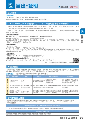 %u25aa%u53d7%u4ed8%u6642%u9593%u30008%uff1a30%u304b%u308917%uff1a15%u307e%u3067%uff08%u571f%u65e5%u3001%u795d%u65e5%u3001%u5e74%u672b%u5e74%u59cb%u3092%u9664%u304f%uff09%u203b%u51fa%u751f%u5c4a%u30fb%u5a5a%u59fb%u5c4a%u30fb%u6b7b%u4ea1%u5c4a%u7b49%u306f%u3001%u6642%u9593%u5916%u3084%u4f11%u65e5%u3067%u3082%u53d7%u3051%u4ed8%u3051%u3066%u3044%u307e%u3059%u3002%u3000%u6238%u7c4d%u306f%u3001%u89aa%u5b50%u3001%u592b%u5a66%u306a%u3069%u89aa%u65cf%u7684%u8eab%u5206%u95a2%u4fc2%u3092%u767b%u9332%u3001%u8a3c%u660e%u3059%u308b%u3082%u306e%u3067%u3059%u3002%u306a%u304a%u3001%u6238%u7c4d%u306f%u4f4f%u6c11%u7968%u3068%u9055%u3044%u3001%u8ee2%u5165%u30fb%u8ee2%u51fa%u624b%u7d9a%u304d%u7b49%u3067%u306f%u7570%u52d5%u3057%u307e%u305b%u3093%u306e%u3067%u3001%u9ad8%u6d5c%u753a%u306b%u4f4f%u3093%u3067%u3044%u3066%u3082%u3001%u672c%u7c4d%u304c%u9ad8%u6d5c%u753a%u306b%u306a%u3044%u5834%u5408%u304c%u3042%u308a%u307e%u3059%u3002%u25aa%u4e3b%u306a%u5c4a%u51fa%uff08%u4e0b%u306e%u8868%u306b%u306a%u3044%u5c4a%u51fa%u306b%u3064%u3044%u3066%u306f%u3001%u304a%u554f%u3044%u5408%u308f%u305b%u304f%u3060%u3055%u3044%uff09%u7a2e%u985e %u5c4a%u51fa%u306e%u671f%u9593 %u5c4a%u51fa%u4eba %u5c4a%u51fa%u5148 %u5c4a%u51fa%u306b%u5fc5%u8981%u306a%u3082%u306e %u6ce8%u610f%u4e8b%u9805%u7b49%u51fa%u751f%u5c4a%u751f%u307e%u308c%u305f%u65e5%u304b%u308914%u65e5%u4ee5%u5185 %u7236%u3001%u6bcd %u7236%u6bcd%u306e%u672c%u7c4d%u5730%u304b%u4f4f%u6240%u5730%u3001%u5b50%u3069%u3082%u306e%u51fa%u751f%u5730%u51fa%u751f%u8a3c%u660e%u66f8%u3000%u203b%u539f%u672c%u6bcd%u5b50%u5065%u5eb7%u624b%u5e33%u672c%u4eba%u78ba%u8a8d%u66f8%u985e%u5b50%u3069%u3082%u306e%u540d%u524d%u306b%u4f7f%u7528%u3067%u304d%u308b%u6587%u5b57%u306f%u5e38%u7528%u6f22%u5b57%u3001%u4eba%u540d%u7528%u6f22%u5b57%u3001%u5e73%u4eee%u540d%u3001%u7247%u4eee%u540d%u306b%u9650%u308a%u307e%u3059%u6b7b%u4ea1%u5c4a%u6b7b%u4ea1%u306e%u4e8b%u5b9f%u3092%u77e5%u3063%u305f%u65e5%u304b%u30897%u65e5%u4ee5%u5185%u6b7b%u4ea1%u8005%u306e%u540c%u5c45%u306e%u89aa%u65cf%u3001%u305d%u306e%u4ed6%u306e%u89aa%u65cf%u6b7b%u4ea1%u8005%u306e%u672c%u7c4d%u5730%u304b%u6b7b%u4ea1%u5730%u3001%u5c4a%u51fa%u4eba%u306e%u4f4f%u6240%u5730%u6b7b%u4ea1%u8a3a%u65ad%u66f8%uff08%u6b7b%u4f53%u691c%u6848%u66f8%uff09%u203b%u539f%u672c%u672c%u4eba%u78ba%u8a8d%u66f8%u985e%u5c4a%u51fa%u7d42%u4e86%u5f8c%u3001%u57cb%u706b%u846c%u8a31%u53ef%u8a3c%u3092%u4ea4%u4ed8%u3057%u307e%u3059%u5a5a%u59fb%u5c4a%u5c4a%u51fa%u306e%u3042%u3063%u305f%u65e5%u304b%u3089%u52b9%u529b%u304c%u751f%u3058%u307e%u3059 %u592b%u30fb%u59bb%u306b%u306a%u308b%u4eba %u592b%u53c8%u306f%u59bb%u306e%u672c%u7c4d%u5730%u53c8%u306f%u4f4f%u6240%u5730%u6238%u7c4d%u8b04%u672c%uff08%u9ad8%u6d5c%u753a%u306b%u672c%u7c4d%u304c%u306a%u3044%u65b9%uff09%u3001%u672c%u4eba%u78ba%u8a8d%u66f8%u985e%u5c4a%u51fa%u66f8%u306e%u8a3c%u4eba%u6b04%u306b%u6210%u4eba2%u4eba%u306e%u7f72%u540d%u304c%u5fc5%u8981%u3067%u3059%u3000%u4f4f%u6c11%u7968%u3001%u6238%u7c4d%u95a2%u4fc2%u4ea4%u4ed8%u8acb%u6c42%u3001%u5404%u7a2e%u5c4a%u51fa%u3092%u884c%u3046%u5834%u5408%u306f%u672c%u4eba%u78ba%u8a8d%u3067%u304d%u308b%u3082%u306e%u3092%u63d0%u793a%u3057%u3066%u3044%u305f%u3060%u304f%u5fc5%u8981%u304c%u3042%u308a%u307e%u3059%u3002%u30fb%u672c%u4eba%u78ba%u8a8d%u66f8%u985e1%u70b9%u306e%u63d0%u793a%u3067%u3088%u3044%u3082%u306e%u3000%u5b98%u516c%u7f72%u767a%u884c%u306e%u8eab%u5206%u8a3c%u660e%u66f8%uff08%u5199%u771f%u4ed8%u304d%u306e%u3082%u306e%uff09%u30de%u30a4%u30ca%u30f3%u30d0%u30fc%u30ab%u30fc%u30c9%uff08%u500b%u4eba%u756a%u53f7%u30ab%u30fc%u30c9%uff09%u3001%u904b%u8ee2%u514d%u8a31%u8a3c%u3001%u65c5%u5238%uff08%u30d1%u30b9%u30dd%u30fc%u30c8%uff09%u3001%u5728%u7559%u30ab%u30fc%u30c9%u3001%u7279%u5225%u6c38%u4f4f%u8005%u8a3c%u660e%u66f8%u306a%u30692%u70b9%u306e%u63d0%u793a%u304c%u5fc5%u8981%u306a%u3082%u306e%u5065%u5eb7%u4fdd%u967a%u88ab%u4fdd%u967a%u8005%u8a3c%u3001%u5f8c%u671f%u9ad8%u9f62%u533b%u7642%u88ab%u4fdd%u967a%u8005%u8a3c%u3001%u4ecb%u8b77%u4fdd%u967a%u8a3c%u3001%u5e74%u91d1%u8a3c%u66f8%u3001%u5e74%u91d1%u624b%u5e33%u306a%u3069%u7a93%u53e3%u3067%u306e%u672c%u4eba%u78ba%u8a8d%u0008%u6238%u7c4d%u306e%u5c4a%u51fa%u0008%u7a93%u53e3%u53d7%u4ed8%u0008%u5c4a%u51fa%u30fb%u8a3c%u660e %u554f %u4f4f%u6c11%u751f%u6d3b%u8ab2%u3000%u260e72-7703%u3000%u30de%u30a4%u30ca%u30f3%u30d0%u30fc%u30ab%u30fc%u30c9%uff08%u500b%u4eba%u756a%u53f7%u30ab%u30fc%u30c9%uff09%u3092%u304a%u6301%u3061%u306e%u65b9%u304c%u3001%u5168%u56fd%u306e%u30b3%u30f3%u30d3%u30cb%u30a8%u30f3%u30b9%u30b9%u30c8%u30a2%u306b%u8a2d%u7f6e%u3055%u308c%u3066%u3044%u308b%u30de%u30eb%u30c1%u30b3%u30d4%u30fc%u6a5f%u3092%u5229%u7528%u3057%u3066%u3001%u4f4f%u6c11%u7968%u306e%u5199%u3057%u306a%u3069%u306e%u5404%u7a2e%u8a3c%u660e%u66f8%u3092%u53d6%u5f97%u3067%u304d%u308b%u30b5%u30fc%u30d3%u30b9%u3067%u3059%u3002%u3000%u304a%u8fd1%u304f%u306e%u30b3%u30f3%u30d3%u30cb%u30a8%u30f3%u30b9%u30b9%u30c8%u30a2%u3092%u5229%u7528%u3059%u308b%u3053%u3068%u3067%u3001%u7533%u8acb%u66f8%u3092%u8a18%u5165%u3059%u308b%u5fc5%u8981%u304c%u306a%u304f%u3001%u3054%u81ea%u8eab%u306e%u90fd%u5408%u306e%u3088%u3044%u6642%u9593%u306b%u53d7%u3051%u53d6%u308b%u3053%u3068%u304c%u3067%u304d%u307e%u3059%u3002%u2002%u53d6%u5f97%u3067%u304d%u308b%u8a3c%u660e%u66f8%u2002%u30fb%u4f4f%u6c11%u7968%u306e%u5199%u3057%u3000%u30fb%u5370%u9451%u767b%u9332%u8a3c%u660e%u66f8%u3000%u30fb%u6240%u5f97%u8a3c%u660e%u66f8%u3000%u30fb%u6240%u5f97%u30fb%u8ab2%u7a0e%u8a3c%u660e%u66f8%u30fb%u6238%u7c4d%u8b04%u672c%uff08%u6284%u672c%uff09%u203b%u3000%u3000%u3000%u3000%u3000%u3000%u3000%u2004%u2004%u2004%u30fb%u6238%u7c4d%u306e%u9644%u7968%u306e%u5199%u3057%u203b%u203b%u672c%u7c4d%u5730%u304c%u9ad8%u6d5c%u753a%u3067%u3001%u4f4f%u6240%u304c%u9ad8%u6d5c%u753a%u5916%u306e%u65b9%u306f%u6700%u521d%u306b%u30de%u30eb%u30c1%u30b3%u30d4%u30fc%u6a5f%u3067%u5229%u7528%u767b%u9332%u7533%u8acb%u304c%u5fc5%u8981%u3067%u3059%u3002%u7533%u8acb%u304b%u30895%u958b%u5e81%u65e5%u4ee5%u964d%u306b%u30b5%u30fc%u30d3%u30b9%u3092%u3054%u5229%u7528%u3044%u305f%u3060%u3051%u307e%u3059%u3002%u2002%u5229%u7528%u53ef%u80fd%u6642%u9593%u2002%u30
