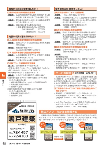 %u25aa%u9ad8%u6d5c%u306e%u4f1d%u7d71%u7684%u6c11%u5bb6%u666e%u53ca%u4fc3%u9032%u4e8b%u696d%u2002%u5bfe%u8c61%u7269%u2002%u3000 %u4f1d%u7d71%u7684%u6c11%u5bb6%uff08%u798f%u4e95%u770c%u4f1d%u7d71%u7684%u6c11%u5bb6%u8a8d%u5b9a%uff09%u3084%u4f1d%u7d71%u7684%u6c11%u5bb6%u306b%u4ed8%u5c5e%u3059%u308b%u571f%u8535%u3001%u5de5%u4f5c%u7269%uff08%u5840%u53ca%u3073%u9580%uff09%u2002%u5bfe%u8c61%u8005%u2002 %u753a%u5185%u696d%u8005%u306e%u65bd%u5de5%u306b%u3088%u308a%u4e0a%u8a18%u5bfe%u8c61%u7269%u306e%u65b0%u7bc9%u53c8%u306f%u6539%u4fee%u3092%u5b9f%u65bd%u3057%u305f%u3044%u65b9%u2002%u88dc%u52a9%u984d%u2002%u3000 %u88dc%u52a9%u5bfe%u8c61%u306b%u8981%u3059%u308b%u8cbb%u7528%u306e2%u5206%u306e1 %u4e0a%u9650%u984d%uff1a %u65b0%u7bc9%u3014%u63a8%u9032%u5730%u533a%u306e%u307f%u3015160%u4e07%u5186 %u6539%u4fee%u3014%u63a8%u9032%u5730%u533a%u3015%u3000%u3000300%u4e07%u5186 %u3000%u3000%u3014%u63a8%u9032%u5730%u533a%u5916%u3015%u3000200%u4e07%u5186%u6614%u306a%u304c%u3089%u306e%u6211%u304c%u5bb6%u3092%u6b8b%u3057%u305f%u3044%uff01%u25aa%u9ad8%u6d5c%u753a%u7a7a%u304d%u5bb6%u30ea%u30d5%u30a9%u30fc%u30e0%u652f%u63f4%u4e8b%u696d%u2002%u5bfe%u8c61%u7269%u2002%u3000 1%u5e74%u4ee5%u4e0a%u5c45%u4f4f%u8005%u306e%u3044%u306a%u3044%u4f4f%u5b85%u2002%u5bfe%u8c61%u8005%u2002%u3000 %u753a%u5185%u696d%u8005%u306e%u65bd%u5de5%u306b%u3088%u308a%u4e0a%u8a18%u5bfe%u8c61%u7269%u306e%u6539%u4fee%u3084%u8377%u7269%u64a4%u53bb%u3092%u5b9f%u65bd%u3057%u305f%u3044%u65b9%u3001%u307e%u305f%u753a%u5185%u306b%u4f4f%u6240%u3092%u6709%u3057%u7a7a%u304d%u5bb6%u3092%u5229%u6d3b%u7528%u3057%u305f%u3044%u65b9%u2002%u88dc%u52a9%u984d%u2002%u3000 %u88dc%u52a9%u5bfe%u8c61%u306b%u8981%u3059%u308b%u8cbb%u7528%u306e2%u5206%u306e1 %uff08%u4e0a%u9650%u984d%uff1a100%u4e07%u5186%uff09%u25aa%u9ad8%u6d5c%u753a%u7a7a%u304d%u5bb6%u9069%u6b63%u7ba1%u7406%u4fc3%u9032%u4e8b%u696d%u2002%u5bfe%u8c61%u8005%u2002%u3000 %u753a%u5185%u306b%u5b58%u3059%u308b%u7a7a%u304d%u5bb6%u306e%u6240%u6709%u8005%u7b49%u3067%u7a7a%u304d%u5bb6%u304c %u5468%u8fba%u306b%u60aa%u5f71%u97ff%u3092%u53ca%u307c%u3059%u3053%u3068%u3092%u9632%u304e%u3001%u7a7a%u304d%u5bb6%u306e %u9069%u6b63%u7ba1%u7406%u3092%u56f3%u308b%u3053%u3068%u3092%u76ee%u7684%u306b%u3001%u7a7a%u304d%u5bb6%u306e%u7ba1%u7406 %u4ee3%u884c%u30b5%u30fc%u30d3%u30b9%u3092%u5229%u7528%u3059%u308b%u65b9%u2002%u88dc%u52a9%u984d%u2002 %u7ba1%u7406%u4ee3%u884c%u30b5%u30fc%u30d3%u30b9%u306e%u5229%u7528%u306b%u8981%u3057%u305f%u7d4c%u8cbb%u306e3%u5206%u306e1%u9650%u5ea6%u984d%uff1a1%u5e74%u3042%u305f%u308a3%u4e076,000%u5186%u25aa%u9ad8%u6d5c%u753a%u8001%u673d%u5371%u967a%u7a7a%u304d%u5bb6%u7b49%u9664%u5374%u652f%u63f4%u4e8b%u696d%u2002%u5bfe%u8c61%u8005%u2002%u3000 %u7a7a%u304d%u5bb6%u306e%u6240%u6709%u8005%u53c8%u306f%u76f8%u7d9a%u4eba%u3067%u7a7a%u304d%u5bb6%u306e%u9664%u5374%uff08%u89e3%u4f53%uff09%u3092%u5b9f%u65bd%u3057%u305f%u3044%u65b9%u2002%u88dc%u52a9%u984d%u2002%u30fb%u8001%u673d%u5371%u967a%u7a7a%u304d%u5bb6 %u3000%u88dc%u52a9%u5bfe%u8c61%u306b%u8981%u3059%u308b%u8cbb%u7528%u306e4%u5206%u306e3%u3000%u9650%u5ea6%u984d%uff1a150%u4e07%u5186 %u30fb%u6e96%u8001%u673d%u5371%u967a%u7a7a%u304d%u5bb6 %u3000%u88dc%u52a9%u5bfe%u8c61%u306b%u8981%u3059%u308b%u8cbb%u7528%u306e2%u5206%u306e1%u3000%u9650%u5ea6%u984d%uff1a100%u4e07%u5186 %u30fb%u305d%u306e%u4ed6%u306e%u7a7a%u304d%u5bb6 %u3000%u88dc%u52a9%u5bfe%u8c61%u306b%u8981%u3059%u308b%u8cbb%u7528%u306e2%u5206%u306e1%u3000%u9650%u5ea6%u984d%uff1a100%u4e07%u5186%u7a7a%u304d%u5bb6%u306e%u6d3b%u7528%u30fb%u64a4%u53bb%u3092%u3057%u305f%u3044%uff01%u25aa%uff21%uff0e%u9ad8%u6d5c%u753a%u6728%u9020%u4f4f%u5b85%u8010%u9707%u8a3a%u65ad%u7b49%u4fc3%u9032%u4e8b%u696d%u2002%u5bfe%u8c61%u8005%u2002%u3000 %u662d%u548c56%u5e745%u670831%u65e5%u4ee5%u524d%u306b%u7740%u5de5%u3055%u308c%u305f%u6728%u9020%u4f4f%u5b85%u306e%u6240%u6709%u8005%u2002%u88dc%u52a9%u984d%u2002%u3000 %u8010%u9707%u8a3a%u65ad%u30fb%u88dc%u5f37%u30d7%u30e9%u30f3 92,000%u5186%uff08%u500b%u4eba%u8ca0%u62c510,000%u5186%uff09%u25aa%uff22%uff0e%u9ad8%u6d5c%u753a%u6728%u9020%u4f4f%u5b85%u8010%u9707%u6539%u4fee%u4fc3%u9032%u4e8b%u696d%u2002%u5bfe%u8c61%u8005%u2002%u3000 %uff21%u306e%u8010%u9707%u8a3a%u65ad%u30fb%u88dc%u5f37%u30d7%u30e9%u30f3%u3092%u53d7%u3051%u3066%u3001%u8010%u9707%u6539%u4fee%u5de5%u4e8b%u3092%u5b9f%u65bd%u3057%u305f%u3044%u65b9%u2002%u88dc%u52a9%u984d%u2002%u3000%u6539%u4fee%u8cbb%u306e100%uff05%u306e%u984d%uff08%u4e0a%u9650%u984d200%u4e07%u5186%uff09%u25aa%u5371%u967a%u30d6%u30ed%u30c3%u30af%u5840%u7b49%u9664%u5374%u652f%u63f4%u4e8b%u696d%u2002%u8981%u3000%u4ef6%u2002%u3000%u6b21%u306e%u8981%u4ef6%u3092%u3059%u3079%u3066%u6e80%u305f%u3059%u3053%u3068%u30fb%u5b89%u5168%u6027%u3092%u78ba%u8a8d%u3067%u304d%u306a%u3044%u30d6%u30ed%u30c3%u30af%u5840%u7b49%u306e%u64a4%u53bb%u3067%u3042%u308b%u3053%u3068%u30fb%u9ad8%u3055%u304c80%u339d%u4ee5%u4e0a%u306e%u30d6%u30ed%u30c3%u30af%u5840%u3067%u3042%u308b%u3053%u3068%u30fb%u753a%u5185%u696d%u8005%u306e%u65bd%u5de5%u306b%u3088%u308b%u64a4%u53bb%u3067%u3042%u308b%u3053%u3068%u2002%u88dc%u52a9%u984d%u2002%u3000%u6b21%u306e%u2460%u2461%u306e%u5408%u8a08%u984d%uff08%u5343%u5186%u672a%u6e80%u5207%u308a%u6368%u3066%uff09%u2460 %u9053%u8def%u7b49%u306b%u9762%u3059%u308b%u30d6%u30ed%u30c3%u30af%u5840%u7b49%u306e%u64a4%u53bb%u306b%u5bfe%u3059%u308b%u88dc%u52a9 %uff08%u6b21%u306e%u3046%u3061%u6700%u3082%u4f4e%u3044%u984d%uff09%u30fb%u88dc%u52a9%u5bfe%u8c61%u9762%u7a4d%uff08%u33a1%uff09%u00d71%u33a1%u3042%u305f%u308a%u306e%u5358%u4fa16,000%u5186%u30fb%u898b%u7a4d%u91d1%u984d%uff08%u7a0e%u629c%uff09%u306e3%u5206%u306e2%u30fb%u9650%u5ea6%u984d20%u4e07%u5186%u2461 %u798f%u4e95%u770c%u7523%u6750%u6728%u5840%u3067%u306e%u5efa%u3066%u66ff%u3048%u306b%u5bfe%u3059%u308b%u88dc%u52a9 %uff08%u6b21%u306e%u3046%u3061%u6700%u3082%u4f4e%u3044%u984d%uff09%u30fb%u898b%u7a4d%u91d1%u984d%uff08%u7a0e%u629c%uff09%u306e3%u5206%u306e2%u30fb%u9650%u5ea6%u984d40%u4e07%u5186%u5730%u9707%u304b%u3089%u6211%u304c%u5bb6%u3092%u5b88%u308a%u305f%u3044%uff01%u9ad8%u6d5c%u753a%u5185%u306b%u304a%u3044%u3066%u30c6%u30ec%u30