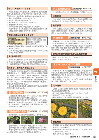 %u3000%u72ac%u306e%u6240%u6709%u8005%u306f%u3001%u72ac%u3092%u53d6%u5f97%u3057%u305f%u65e5%uff08%u751f%u5f8c90%u65e5%u4ee5%u5185%u306b%u72ac%u3092%u53d6%u5f97%u3057%u305f%u5834%u5408%u306b%u3042%u3063%u3066%u306f%u3001%u751f%u5f8c90%u65e5%u3092%u7d4c%u904e%u3057%u305f%u65e5%uff09%u304b%u308930%u65e5%u4ee5%u5185%u306b%u3001%u72ac%u306e%u767b%u9332%u3092%u7533%u8acb%u3057%u306a%u3051%u308c%u3070%u306a%u308a%u307e%u305b%u3093%u3002%u30fb%u9451%u672d%u3001%u6ce8%u5c04%u6e08%u7968%u306f%u72ac%u306b%u4ed8%u3051%u307e%u3057%u3087%u3046%u3002%u30fb%u72ac%u306e%u653e%u3057%u98fc%u3044%u306f%u3084%u3081%u307e%u3057%u3087%u3046%u3002%u30fb%u7cde%u306e%u5f8c%u59cb%u672b%u306f%u3057%u3063%u304b%u308a%u3084%u308a%u307e%u3057%u3087%u3046%u3002%u30fb%u7e41%u6b96%u5236%u9650%u3082%u8003%u3048%u307e%u3057%u3087%u3046%u3002%u30fb%u98fc%u3044%u72ac%u306f%u3067%u304d%u308b%u9650%u308a%u7d42%u751f%u98fc%u990a%u3057%u3066%u304f%u3060%u3055%u3044%u3002%u30fb%u98fc%u990a%u3067%u304d%u306a%u304f%u306a%u3063%u305f%u5834%u5408%u306f%u3001%u65b0%u305f%u306a%u98fc%u4e3b%u3092%u898b%u3064%u3051%u308b%u306a%u3069%u98fc%u990a%u3092%u53d7%u3051%u308b%u6a5f%u4f1a%u3092%u4e0e%u3048%u3066%u304f%u3060%u3055%u3044%u3002%u65b0%u3057%u304f%u72ac%u3092%u98fc%u308f%u308c%u308b%u3068%u304d%u3000%u5c71%u306b%u5165%u308b%u3068%u304d%u306f%u3001%u9234%u306a%u3069%u306e%u97f3%u306e%u51fa%u308b%u3082%u306e%u3092%u643a%u5e2f%u3057%u3001%u81ea%u5206%u306e%u5b58%u5728%u3092%u30af%u30de%u306b%u77e5%u3089%u305b%u308b%u3088%u3046%u306b%u3057%u307e%u3057%u3087%u3046%u3002%u6ce8%u610f%u4e8b%u9805%u3000%u30af%u30de%u3068%u906d%u9047%u3057%u305f%u300c%u65e5%u6642%u300d%u300c%u5834%u6240%u300d%u300c%u76ee%u6483%u7b87%u6240%u304b%u3089%u306e%u79fb%u52d5%u5148%u300d%u7b49%u306e%u60c5%u5831%u3092%u3054%u9023%u7d61%u304f%u3060%u3055%u3044%u3002%uff08%u901a%u5831%u3044%u305f%u3060%u3044%u305f%u65b9%u306e%u9023%u7d61%u5148%u306b%u3064%u3044%u3066%u3082%u78ba%u8a8d%u3055%u305b%u3066%u3044%u305f%u3060%u304d%u307e%u3059%u3002%uff09%u78ba%u8a8d%u4e8b%u9805%u5916%u6765%u751f%u7269%u3068%u306f%u3001%u3082%u3068%u3082%u3068%u305d%u306e%u5730%u57df%u306b%u306f%u3044%u306a%u304b%u3063%u305f%u306e%u306b%u3001%u4eba%u306b%u3088%u3063%u3066%u6301%u3061%u8fbc%u307e%u308c%u305f%u52d5%u7269%u3084%u690d%u7269%u306e%u3053%u3068%u3092%u3044%u3044%u307e%u3059%u3002%u3000%u5916%u6765%u751f%u7269%u6cd5%u3067%u306f%u3001%u300c%u7279%u5b9a%u5916%u6765%u751f%u7269%u300d%u306b%u6307%u5b9a%u3055%u308c%u305f%u751f%u7269%u3092%u98fc%u80b2%u30fb%u683d%u57f9%u30fb%u4fdd%u7ba1%u30fb%u904b%u642c%u30fb%u8ca9%u58f2%u30fb%u8b72%u6e21%u30fb%u8f38%u5165%u30fb%u91ce%u5916%u306b%u653e%u3064%u3053%u3068%u306a%u3069%u3092%u7981%u6b62%u3057%u3066%u304a%u308a%u3001%u9055%u53cd%u3059%u308b%u3068%u7f70%u5247%u304c%u3042%u308a%u307e%u3059%u3002%u5916%u6765%u751f%u7269%u0008 %u554f %u7523%u696d%u632f%u8208%u8ab2%u3000%u260e72-7705%u30aa%u30aa%u30ad%u30f3%u30b1%u30a4%u30ae%u30af%u306f%u3001%u9451%u8cde%u7528%u30fb%u7dd1%u5316%u7528%u3068%u3057%u3066%u4f7f%u7528%u3055%u308c%u3066%u3044%u307e%u3057%u305f%u304c%u3001%u7e41%u6b96%u529b%u304c%u5f37%u304f%u5f37%u5065%u306a%u305f%u3081%u3001%u65e5%u672c%u306b%u6614%u304b%u3089%u3042%u308b%u690d%u7269%u3092%u99c6%u9010%u3057%u3066%u3057%u307e%u3046%u3053%u3068%u304b%u3089%u3001%u5e73%u621018%u5e74%u306b%u300c%u7279%u5b9a%u5916%u6765%u751f%u7269%u300d%u306b%u6307%u5b9a%u3055%u308c%u307e%u3057%u305f%u3002%u3000%u5ead%u5148%u3084%u7551%u306a%u3069%u306b%u30aa%u30aa%u30ad%u30f3%u30b1%u30a4%u30ae%u30af%u304c%u751f%u3048%u3066%u3044%u308b%u5834%u5408%u306f%u3001%u3054%u81ea%u8eab%u3067%u99c6%u9664%u3092%u884c%u3063%u3066%u304f%u3060%u3055%u3044%u3002%u30fb%u6839%u3092%u6b8b%u3055%u306a%u3044%u3088%u3046%u629c%u304d%u53d6%u308b%uff08%u7a2e%u5b50%u304c%u3067%u304d%u308b%u958b%u82b1%u524d%u306b%u5208%u308a%u53d6%u308b%u3053%u3068%u3082%u52b9%u679c%u7684%uff09%u3002%u30fb%u7a2e%u5b50%u304c%u98db%u6563%u3059%u308b%u306e%u3092%u9632%u6b62%u3059%u308b%u305f%u3081%u3001%u30d3%u30cb%u30fc%u30eb%u888b%u306b%u5165%u308c%u3066%u5bc6%u5c01%u3057%u67af%u6b7b%u3055%u305b%u308b%u3002%u30fb%u71c3%u3048%u308b%u30b4%u30df%u3068%u3057%u3066%u51e6%u5206%u3059%u308b%u3002%u30005%u6708%u304b%u30897%u6708%u306b%u304b%u3051%u3066%u9ec4%u8272%u306e%u30b3%u30b9%u30e2%u30b9%u306b%u4f3c%u305f%u82b1%u3092%u54b2%u304b%u305b%u308b%u5317%u7c73%u539f%u7523%u306e%u690d%u7269%u3067%u3059%u3002%u30fb%u82b1%u3073%u3089%u306e%u5148%u7aef%u306f%u3001%u4e0d%u898f%u5247%u306b4%uff5e5%u3064%u306b%u5206%u304b%u308c%u3066%u3044%u308b%u30fb%u8349%u4e08%u306f50%uff5e70%u30bb%u30f3%u30c1%u307b%u3069%u30fb%u8449%u306f%u3001%u7d30%u9577%u3044%u3078%u3089%u72b6%u3067%u4e21%u9762%u306b%u8352%u3044%u6bdb%u304c%u751f%u3048%u3066%u3044%u308b%u30fb%u52d5%u7269%u3000%u30cc%u30fc%u30c8%u30ea%u30a2%u30fb%u30a2%u30e9%u30a4%u30b0%u30de%u30fb%u30cf%u30af%u30d3%u30b7%u30f3%u30fb%u690d%u7269%u3000%u30aa%u30aa%u30ad%u30f3%u30b1%u30a4%u30ae%u30af%u5bfe%u51e6%u65b9%u6cd5%u82b1%u306e%u7279%u5fb4%u753a%u5185%u306b%u751f%u606f%u304c%u78ba%u8a8d%u3055%u308c%u3066%u3044%u308b%u5916%u6765%u751f%u7269%u30aa%u30aa%u30ad%u30f3%u30b1%u30a4%u30ae%u30af%u306e%u99c6%u9664%u554f %u7523%u696d%u632f%u8208%u8ab2%u3000%u260e72-7705%u30af%u30de%u3092%u767a%u898b%u3057%u305f%u3089%u3001%u305f%u3060%u3061%u306b%u7523%u696d%u632f%u8208%u8ab2%u307e%u3067%u3054%u9023%u7d61%u304f%u3060%u3055%u3044%u3002%u72ac%u306e%u65b0%u898f%u767b%u9332 %u624b%u6570%u6599 4,000%u5186%u30fb%u5370%u9451%u72c2%u72ac%u75c5%u4e88%u9632%u6ce8%u5c04%u6e08%u7968%u306e%u4ea4%u4ed8 %u624b%u6570%u6599 700%u5186%u30fb%u6ce8%u5c04%u6e08%u8a3c%u30fb%u5370%u9451%u72ac%u306e%u6b7b%u4ea1%u5c4a %u5370%u9451%u30fb%u9451%u672d%u30fb%u6ce8%u5c04%u6e08%u7968%u72ac%u306e%u6240%u5728%u5730%u7b49%u306e%u5909%u66f4%u5c4a %u5370%u9451%u30fb%u6ce8%u5c04%u6e08%u7968%u7533%u8acb%u30fb%u5c4a%u51fa%u306b%u5fc5%u8981%u3068%u306a%u308b%u3082%u306e%uff0a%u624b%u6570%u6599%u3001%u5370%u9451%u7b49%u5fc5%u8981%u306a%u3082%u306e%u3092%u6301%u3063%u3066%u4f4f%u6c11%u751f%u6d3b%u8ab2%u307e%u3067%u304a%u8d8a%