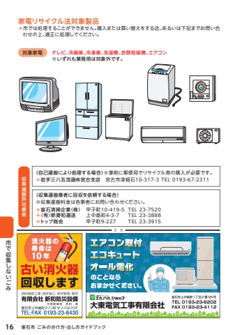 %u5bb6%u96fb%u30ea%u30b5%u30a4%u30af%u30eb%u6cd5%u5bfe%u8c61%u88fd%u54c1%u25cf%u5e02%u3067%u306f%u51e6%u7406%u3059%u308b%u3053%u3068%u304c%u3067%u304d%u307e%u305b%u3093%u3002%u8cfc%u5165%u307e%u305f%u306f%u8cb7%u3044%u66ff%u3048%u3092%u3059%u308b%u5e97%u3001%u3042%u308b%u3044%u306f%u4e0b%u8a18%u307e%u3067%u304a%u554f%u3044%u5408%u308f%u305b%u306e%u4e0a%u3001%u9069%u6b63%u306b%u51e6%u7406%u3057%u3066%u304f%u3060%u3055%u3044%u3002%uff08%u81ea%u5df1%u904b%u642c%u306b%u3088%u308a%u51e6%u7406%u3059%u308b%u5834%u5408%uff09%u203b%u4e8b%u524d%u306b%u90f5%u4fbf%u5c40%u3067%u30ea%u30b5%u30a4%u30af%u30eb%u5238%u306e%u8cfc%u5165%u304c%u5fc5%u8981%u3067%u3059%u3002%u25cf%u5ca9%u624b%u4e09%u516b%u4e94%u6d41%u901a%u3231%u5bae%u53e4%u652f%u5e97%u3000%u5bae%u53e4%u5e02%u6d25%u8efd%u77f310-317-3 TEL 0193-67-2311%uff08%u53ce%u96c6%u904b%u642c%u696d%u8005%u306b%u56de%u53ce%u3092%u4f9d%u983c%u3059%u308b%u5834%u5408%uff09%u203b%u53ce%u96c6%u904b%u642c%u6599%u91d1%u306f%u5404%u696d%u8005%u306b%u304a%u554f%u3044%u5408%u308f%u305b%u304f%u3060%u3055%u3044%u3002%u25cf%u91dc%u77f3%u6e05%u6383%u4f01%u696d%uff08%u682a%uff09 %u7532%u5b50%u753a10-419-%uff15 TEL 23-7520%u25cf%uff08%u6709%uff09%u65b0%u83f1%u548c%u904b%u9001 %u4e0a%u4e2d%u5cf6%u753a%uff14-%uff13-%uff17 TEL 23-3888%u25cf%u30c8%u30c3%u30d7%u5546%u4f1a %u7532%u5b50%u753a%uff19-227 TEL 23-3915%u5bfe%u8c61%u5bb6%u96fb %u30c6%u30ec%u30d3%u3001%u51b7%u8535%u5eab%u3001%u51b7%u51cd%u5eab%u3001%u6d17%u6fef%u6a5f%u3001%u8863%u985e%u4e7e%u71e5%u6a5f%u3001%u30a8%u30a2%u30b3%u30f3%u3000%u203b%u3044%u305a%u308c%u3082%u696d%u52d9%u7528%u306f%u5bfe%u8c61%u5916%u3067%u3059%u3002%u53ce%u96c6%u904b%u642c%u8a31%u53ef%u696d%u800516 %u91dc%u77f3%u5e02 %u3054%u307f%u306e%u5206%u3051%u65b9%u30fb%u51fa%u3057%u65b9%u30ac%u30a4%u30c9%u30d6%u30c3%u30af%u5e02%u3067%u53ce%u96c6%u3057%u306a%u3044%u3054%u307f