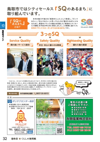 %u9ce5%u53d6%u5e02%u3067%u306f%u30b7%u30c6%u30a3%u30bb%u30fc%u30eb%u30b9%u53d6%u308a%u7d44%u3093%u3067%u3044%u307e%u3059%u3002%u3000%u672c%u5e02%u306e%u9b45%u529b%u3084%u5f37%u307f%u3092%u300c%u9ce5%u53d6%u5e02%u3089%u3057%u3055%u300d%u3068%u3057%u3066%u767a%u4fe1%u3057%u3001%u300c%u884c%u3063%u3066%u307f%u305f%u3044%u300d%u3001%u300c%u4f4f%u3093%u3067%u307f%u305f%u3044%u300d%u3068%u601d%u3063%u3066%u3082%u3089%u3048%u308b%u300c%u9078%u3070%u308c%u308b%u307e%u3061%u300d%u3068%u306a%u308b%u305f%u3081%u306b%u3001%u9ce5%u53d6%u5e02%u30d6%u30e9%u30f3%u30c9%u306e%u78ba%u7acb%u3092%u76ee%u6307%u3057%u305f%u300c%u9ce5%u53d6%u5e02%u30b7%u30c6%u30a3%u30bb%u30fc%u30eb%u30b9%u6226%u7565%u300d%u3092%u5e73%u621029%u5e742%u6708%u306b%u7b56%u5b9a%u3057%u307e%u3057%u305f%u3002%u3053%u306e%u6226%u7565%u306b%u57fa%u3065%u3044%u305f%u672c%u5e02%u306e%u30d6%u30e9%u30f3%u30c9%u30b9%u30ed%u30fc%u30ac%u30f3%u304c%u300cSQ%u306e%u3042%u308b%u307e%u3061%u300d%u3067%u3059%u3002%u3092%u5c55%u958b%u3057%u3001%u89b3%u5149%u632f%u8208%u3084%u79fb%u4f4f%u5b9a%u4f4f%u306a%u3069%u3092%u4fc3%u9032%u3057%u307e%u3059%u3002%u554f%u3044%u5408%u308f%u305b%u51483%u3064%u306eSQService Quality%u8cea%u306e%u9ad8%u3044%u30b5%u30fc%u30d3%u30b9%u63d0%u4f9b%u672c%u5e81%u820e%u653f%u7b56%u4f01%u753b%u8ab2%uff0f%u3000 0857-30-8013Safety Quality%u5b89%u5168%u30fb%u5b89%u5fc3%u306b%u66ae%u3089%u305b%u308b%u74b0%u5883Sightseeing Quality%u512a%u308c%u305f%u9b45%u529b%u8cc7%u6e90%u306e%u3042%u308b%u307e%u3061SQ%u306e%u3042%u308b%u307e%u3061%u3068%u306f%uff1f32%u3008%u5e83 %u544a%u3009