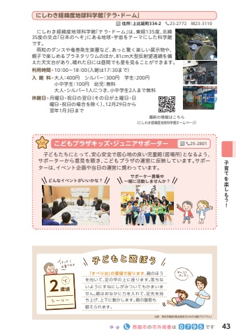 %u3000%u306b%u3057%u308f%u304d%u7d4c%u7def%u5ea6%u5730%u7403%u79d1%u5b66%u9928%u300c%u30c6%u30e9%u30fb%u30c9%u30fc%u30e0%u300d%u306f%u3001%u6771%u7d4c135%u5ea6%u3001%u5317%u7def35%u5ea6%u306e%u4ea4%u70b9%u300c%u65e5%u672c%u306e%u3078%u305d%u300d%u306b%u3042%u308b%u5730%u7403%u30fb%u5b87%u5b99%u3092%u30c6%u30fc%u30de%u306b%u3057%u305f%u79d1%u5b66%u9928%u3067%u3059%u3002%u3000%u96e8%u7c92%u306e%u30c0%u30f3%u30b9%u3084%u7adc%u5dfb%u767a%u751f%u88c5%u7f6e%u306a%u3069%u3001%u3042%u3063%u3068%u9a5a%u304f%u697d%u3057%u3044%u5c55%u793a%u7269%u3084%u3001%u89aa%u5b50%u3067%u697d%u3057%u3081%u308b%u30d7%u30e9%u30cd%u30bf%u30ea%u30a6%u30e0%u306e%u307b%u304b%u300181cm%u5927%u578b%u53cd%u5c04%u671b%u9060%u93e1%u3092%u5099%u3048%u305f%u5929%u6587%u53f0%u304c%u3042%u308a%u3001%u6674%u308c%u305f%u65e5%u306b%u306f%u663c%u9593%u3067%u3082%u661f%u3092%u898b%u308b%u3053%u3068%u304c%u3067%u304d%u307e%u3059%u3002%u5229%u7528%u6642%u9593%u0008%u00bb10%uff1a00%uff5e18%uff1a00%uff08%u5165%u9928%u306f17%uff1a30%u307e%u3067%uff09%u5165%u2002%u9928%u2002%u6599%u0008%u00bb%u0007%u5927%u4eba%uff1a400%u5186%u3000%u30b7%u30eb%u30d0%u30fc%uff1a300%u5186%u3000%u5b66%u751f%uff1a200%u5186%u0007%u5c0f%u4e2d%u5b66%u751f%uff1a100%u5186%u3000%u5e7c%u5150%uff1a%u7121%u6599%u0007%u5927%u4eba%u30fb%u30b7%u30eb%u30d0%u30fc1%u4eba%u306b%u3064%u304d%u3001%u5c0f%u4e2d%u5b66%u751f2%u4eba%u307e%u3067%u7121%u6599%u4f11%u9928%u65e5%u0008%u00bb%u0007%u6708%u66dc%u65e5%u30fb%u795d%u65e5%u306e%u7fcc%u65e5%uff08%u305d%u306e%u65e5%u304c%u571f%u66dc%u65e5%u30fb%u65e5%u66dc%u65e5%u30fb%u795d%u65e5%u306e%u5834%u5408%u3092%u9664%u304f%uff09%u300112%u670829%u65e5%u304b%u3089%u7fcc%u5e741%u67083%u65e5%u307e%u3067%u554f%u4f4f%u6240%uff1a%u4e0a%u6bd4%u5ef6%u753a334-2%u3000%u260e23-2772%u3000%uff26%uff21%uff38%u000823-3110%u6700%u65b0%u306e%u60c5%u5831%u306f%u3053%u3061%u3089%uff08%u306b%u3057%u308f%u304d%u7d4c%u7def%u5ea6%u5730%u7403%u79d1%u5b66%u9928%u30db%u30fc%u30e0%u30da%u30fc%u30b8%uff09%u3000%u5b50%u3069%u3082%u305f%u3061%u306b%u3068%u3063%u3066%u3001%u5b89%u5fc3%u5b89%u5168%u3067%u5c45%u5fc3%u5730%u306e%u826f%u3044%u5150%u7ae5%u9928%uff08%u5c45%u5834%u6240%uff09%u3068%u306a%u308b%u3088%u3046%u3001%u30b5%u30dd%u30fc%u30bf%u30fc%u304b%u3089%u610f%u898b%u3092%u8074%u304d%u3001%u3053%u3069%u3082%u30d7%u30e9%u30b6%u306e%u904b%u55b6%u306b%u53cd%u6620%u3057%u3066%u3044%u307e%u3059%u3002%u30b5%u30dd%u30fc%u30bf%u30fc%u306f%u3001%u30a4%u30d9%u30f3%u30c8%u4f01%u753b%u3084%u5f53%u65e5%u306e%u904b%u55b6%u306b%u643a%u308f%u3063%u3066%u3044%u307e%u3059%u3002%u3053%u3069%u3082%u30d7%u30e9%u30b6%u30ad%u30c3%u30ba%u30fb%u30b8%u30e5%u30cb%u30a2%u30b5%u30dd%u30fc%u30bf%u30fc%u554f%u260e25-2801%u3069%u3093%u306a%u30a4%u30d9%u30f3%u30c8%u304c%u3044%u3044%u304b%u306a%uff1f%u30b5%u30dd%u30fc%u30bf%u30fc%u52df%u96c6%u4e2d%u4e00%u7dd2%u306b%u6d3b%u52d5%u3057%u307e%u305b%u3093%u304b%uff1f%u300c%u3059%u3079%u308a%u53f0%u300d%u306e%u8981%u9818%u3067%u5ea7%u308a%u307e%u3059%u3002%u89aa%u306e%u307b%u3046%u3092%u5411%u3044%u3066%u3001%u8db3%u306e%u7532%u306e%u4e0a%u306b%u5ea7%u308a%u307e%u3059%u3002%u843d%u3061%u306a%u3044%u3088%u3046%u306b%u3059%u306d%u306b%u3057%u304c%u307f%u3064%u3044%u3066%u3082%u304b%u307e%u3044%u307e%u305b%u3093%u3002%u89aa%u306f%u304a%u306a%u304b%u306b%u529b%u3092%u5165%u308c%u3066%u3001%u8db3%u5148%u3092%u6301%u3061%u4e0a%u3052%u3001%u4e0a%u4e0b%u306b%u52d5%u304b%u3057%u307e%u3059%u3002%u89aa%u306e%u8179%u7b4b%u3082%u935b%u3048%u3089%u308c%u307e%u3059%u3002%u51fa%u5178%u3000%u539a%u751f%u52b4%u50cd%u7701%u300c%u5065%u5168%u80b2%u6210%u306e%u305f%u3081%u306e%u6d3b%u52d5%u30d7%u30ed%u30b0%u30e9%u30e0%u300d%uff12%u6b73%u9803%u897f%u8107%u5e02%u306e%u5e02%u5916%u5c40%u756a%u306f075%u3067%u3059