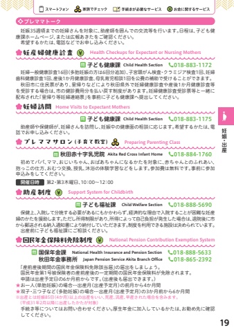 %u3000%u598a%u5a2035%u9031%u9803%u307e%u3067%u306e%u598a%u5a66%u3055%u3093%u3092%u5bfe%u8c61%u306b%u3001%u52a9%u7523%u5e2b%u3092%u56f2%u3093%u3067%u306e%u4ea4%u6d41%u7b49%u3092%u884c%u3044%u307e%u3059%u3002%u65e5%u7a0b%u306f%u3001%u5b50%u3069%u3082%u5065%u5eb7%u8ab2%u30db%u30fc%u30e0%u30da%u30fc%u30b8%u3001%u307e%u305f%u306f%u5e83%u5831%u3042%u304d%u305f%u3092%u3054%u78ba%u8a8d%u304f%u3060%u3055%u3044%u3002%u3000%u5e0c%u671b%u3059%u308b%u304b%u305f%u306f%u3001%u96fb%u8a71%u306a%u3069%u3067%u304a%u7533%u3057%u8fbc%u307f%u304f%u3060%u3055%u3044%u3002%u598a%u5a66%u4e00%u822c%u5065%u5eb7%u8a3a%u67fb16%u56de%uff08%u591a%u80ce%u598a%u5a20%u306e%u65b9%u306f6%u56de%u5206%u8ffd%u52a0%uff09%u3001%u5b50%u5bae%u9838%u304c%u3093%u691c%u67fb%u30fb%u30af%u30e9%u30df%u30b8%u30a2%u691c%u67fb1%u56de%u3001%u598a%u5a66%u6b6f%u79d1%u5065%u5eb7%u8a3a%u67fb1%u56de%u3001%u7523%u5f8c1%u304b%u6708%u5065%u5eb7%u8a3a%u67fb%u3001%u6bcd%u4e73%u80b2%u5150%u76f8%u8ac71%u56de%u3092%u516c%u8cbb%u306e%u88dc%u52a9%u3067%u53d7%u3051%u308b%u3053%u3068%u304c%u3067%u304d%u307e%u3059%u3002%u3000%u79cb%u7530%u5e02%u306b%u4f4f%u6c11%u7968%u304c%u3042%u308a%u3001%u91cc%u5e30%u308a%u306a%u3069%u306b%u3088%u308a%u79cb%u7530%u770c%u5916%u3067%u598a%u5a66%u5065%u5eb7%u8a3a%u67fb%u3084%u7523%u5f8c1%u304b%u6708%u5065%u5eb7%u8a3a%u67fb%u7b49%u3092%u53d7%u8a3a%u3059%u308b%u5834%u5408%u306f%u3001%u5e02%u306e%u5065%u8a3a%u8cbb%u7528%u5206%u3092%u6255%u3044%u623b%u3059%u5236%u5ea6%u304c%u3042%u308a%u307e%u3059%u3002%u598a%u5a66%u5065%u5eb7%u8a3a%u67fb%u53d7%u8a3a%u7968%u7b49%u3068%u4e00%u7dd2%u306b%u914d%u5e03%u3055%u308c%u305f%u300c%u91cc%u5e30%u308a%u7b49%u598a%u5a66%u9023%u7d61%u7968%u300d%u3092%u4e8b%u524d%u306b%u5b50%u3069%u3082%u5065%u5eb7%u8ab2%u3078%u63d0%u51fa%u3057%u3066%u304f%u3060%u3055%u3044%u3002%u554f%u5b50%u3069%u3082%u5065%u5eb7%u8ab2%u2002Child Health Section%u260e018-883-1172%u598a%u7523%u5a66%u5065%u5eb7%u8a3a%u67fb Health Checkups for Expectant or Nursing Mothers%u3000%u52a9%u7523%u5e2b%u3084%u4fdd%u5065%u5e2b%u304c%u3001%u598a%u5a66%u3055%u3093%u3092%u8a2a%u554f%u3057%u3001%u598a%u5a20%u4e2d%u306e%u5065%u5eb7%u9762%u306e%u76f8%u8ac7%u306b%u5fdc%u3058%u307e%u3059%u3002%u5e0c%u671b%u3059%u308b%u304b%u305f%u306f%u3001%u96fb%u8a71%u3067%u304a%u7533%u3057%u8fbc%u307f%u304f%u3060%u3055%u3044%u3002%u554f%u5b50%u3069%u3082%u5065%u5eb7%u8ab2%u2002Child Health Section%u260e018-883-1175%u598a%u5a66%u8a2a%u554fHome Visits to Expectant Mothers%u3000%u521d%u3081%u3066%u30d1%u30d1%u3001%u30de%u30de%u3001%u304a%u3058%u3044%u3061%u3083%u3093%u3001%u304a%u3070%u3042%u3061%u3083%u3093%u306b%u306a%u308b%u304b%u305f%u3092%u5bfe%u8c61%u306b%u3001%u8d64%u3061%u3083%u3093%u3068%u306e%u3075%u308c%u3042%u3044%u3001%u62b1%u3063%u3053%u306e%u4ed5%u65b9%u3001%u304a%u3080%u3064%u4ea4%u63db%u3001%u6388%u4e73%u3001%u6c90%u6d74%u306e%u4f53%u9a13%u5b66%u7fd2%u306a%u3069%u3092%u3057%u307e%u3059%u3002%u53c2%u52a0%u8cbb%u306f%u7121%u6599%u3067%u3059%u3002%u4e8b%u524d%u306b%u53c2%u52a0%u7533%u8fbc%u307f%u3092%u3057%u3066%u304f%u3060%u3055%u3044%u3002%u958b%u50ac%u65e5%u6642%u7b2c2%u30fb%u7b2c3%u6728%u66dc%u65e5%u300110%uff1a00%uff5e12%uff1a00%u554f%u79cb%u7530%u8d64%u5341%u5b57%u4e73%u5150%u9662%u2002Akita Red Cross Infant Home%u260e018-884-1760%u30d7%u30ec%u30de%u30de%u30b5%u30ed%u30f3%uff08%u5b50%u80b2%u3066%u6559%u5ba4%uff09Preparing Parenting Class%u3000%u4fdd%u5065%u4e0a%u3001%u5165%u9662%u3057%u3066%u5206%u5a29%u3059%u308b%u5fc5%u8981%u304c%u3042%u308b%u306b%u3082%u304b%u304b%u308f%u3089%u305a%u3001%u7d4c%u6e08%u7684%u306a%u7406%u7531%u3067%u5165%u9662%u3059%u308b%u3053%u3068%u304c%u56f0%u96e3%u306a%u598a%u7523%u5a66%u306e%u304b%u305f%u3092%u63f4%u52a9%u3057%u307e%u3059%u3002%u305f%u3060%u3057%u6240%u5f97%u5236%u9650%u304c%u3042%u308a%u3001%u6240%u5f97%u306b%u3088%u3063%u3066%u81ea%u5df1%u8ca0%u62c5%u304c%u767a%u751f%u3057%u305f%u5834%u5408%u306f%u3001%u9000%u9662%u5f8c%u306b%u5e02%u304b%u3089%u90f5%u9001%u3055%u308c%u308b%u7d0d%u5165%u901a%u77e5%u66f8%u306b%u3088%u308a%u7d0d%u4ed8%u3057%u3066%u3044%u305f%u3060%u304d%u307e%u3059%u3002%u5236%u5ea6%u3092%u5229%u7528%u3067%u304d%u308b%u65bd%u8a2d%u306f%u6c7a%u3081%u3089%u308c%u3066%u3044%u307e%u3059%u3002%u3000%u51fa%u7523%u524d%u306b%u5b50%u3069%u3082%u798f%u7949%u8ab2%u306b%u3054%u76f8%u8ac7%u304f%u3060%u3055%u3044%u3002%u554f%u5b50%u3069%u3082%u798f%u7949%u8ab2%u3000Child Welfare Section%u260e018-888-5690%u52a9%u7523%u5236%u5ea6 Support System for Childbirth%u3000%u300c%u7523%u524d%u7523%u5f8c%u671f%u9593%u306e%u56fd%u6c11%u5e74%u91d1%u4fdd%u967a%u6599%u514d%u9664%u8a72%u5f53%u5c4a%u300d%u306e%u5c4a%u51fa%u3092%u3057%u307e%u3057%u3087%u3046%u3002%u3000%u56fd%u6c11%u5e74%u91d1%u7b2c1%u53f7%u88ab%u4fdd%u967a%u8005%u306e%u7523%u524d%u7523%u5f8c%u306e%u4e00%u5b9a%u671f%u9593%u306e%u56fd%u6c11%u5e74%u91d1%u4fdd%u967a%u6599%u304c%u514d%u9664%u3055%u308c%u307e%u3059%u3002%u3000%u7533%u8acb%u306f%u51fa%u7523%u4e88%u5b9a%u65e5%u306e6%u304b%u6708%u524d%u304b%u3089%u3067%u3059%u3002%uff08%u51fa%u7523%u5f8c%u3082%u5c4a%u51fa%u3067%u304d%u307e%u3059%u3002%uff09%u2605%u0007%u304a%u4e00%u4eba%uff08%u5358%u80ce%u598a%u5a20%uff09%u306e%u5834%u5408%u2026%u51fa%u7523%u6708%uff08%u51fa%u7523%u4e88%u5b9a%u6708%uff09%u306e%u524d%u6708%u304b%u30894%u304b%u6708%u9593%u2605%u53cc%u5b50%u30fb%u4e09%u3064%u5b50%u306a%u3069%uff08%u591a%u80ce%u598a%u5a20%uff09%u306e%u5834%u5408%u2026%u51fa%u7523%u6708%uff08%u51fa%u7523%u4e88%u5b9a%u6708%uff09%u306e3%u304b%u6708%u524d%u304b%u30896%u304b%u6708%u9593%u203b%u0007%u51fa%u7523%u3068%u306f%u598a%u5a2085%u65e5%uff084%u304b%u6708%uff09%u4ee5%u4e0a%u306e%u51fa%u7523%u3092%u3044%u3044%u3001%u6b7b%u7523%u3001%u6d41%u7523%u3001%u65e9%u7523%u3055%u308c%u305f%u5834%u5408%u3092%u542b%u307f%u307e%u3059%u3002%u3000%uff08%u5e73%u621031%u5e742%u6708%u4ee5%u964d%u306b%u51fa%u7523%u3057%u305f%u304b%u305f%u304c%u5bfe%u8c61%uff09%u3000%u0007%u624b%u7d9a%u304d%u7b49%u306b%u3064%u3044%u3066%u306f%u304a%u554f%u3044%u5408%u308f%u305b%u304f%u3060%u3055%u3044%u3002%u539a%u751f%u5e74%u91d1%u306b%u52a0%u5165%u3
