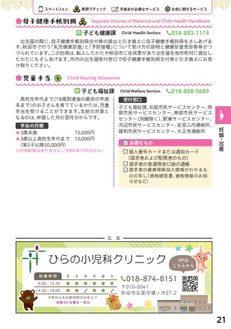 %u3000%u51fa%u751f%u5c4a%u306e%u969b%u306b%u3001%u6bcd%u5b50%u5065%u5eb7%u624b%u5e33%u5225%u518a%u4ea4%u4ed8%u5238%u306e%u63d0%u51fa%u3068%u5f15%u304d%u63db%u3048%u306b%u6bcd%u5b50%u5065%u5eb7%u624b%u5e33%u5225%u518a%u3092%u3055%u3057%u3042%u3052%u307e%u3059%u3002%u79cb%u7530%u5e02%u3067%u884c%u3046%u300c%u4e73%u5150%u5065%u5eb7%u8a3a%u67fb%u300d%u3068%u300c%u4e88%u9632%u63a5%u7a2e%u300d%u306b%u3064%u3044%u3066%u53d7%u3051%u65b9%u306e%u8aac%u660e%u3068%u5065%u5eb7%u8a3a%u67fb%u53d7%u8a3a%u5238%u7b49%u304c%u3064%u3065%u3089%u308c%u3066%u3044%u307e%u3059%u3002%u3053%u306e%u5225%u518a%u306f%u3001%u8ee2%u5165%u3057%u305f%u304b%u305f%u3084%u79cb%u7530%u5e02%u306b%u4f4f%u6c11%u7968%u304c%u3042%u308a%u51fa%u751f%u5c4a%u3092%u4ed6%u5e02%u753a%u6751%u306b%u63d0%u51fa%u3057%u305f%u304b%u305f%u306b%u3082%u3055%u3057%u3042%u3052%u307e%u3059%u3002%u5e02%u5185%u306e%u51fa%u751f%u5c4a%u53d7%u4ed8%u7a93%u53e3%u3067%u6bcd%u5b50%u5065%u5eb7%u624b%u5e33%u5225%u518a%u4ea4%u4ed8%u5238%u3068%u5f15%u304d%u63db%u3048%u306b%u304a%u53d7%u3051%u53d6%u308a%u304f%u3060%u3055%u3044%u3002%u554f%u5b50%u3069%u3082%u5065%u5eb7%u8ab2%u3000Child Health Section%u260e018-883-1174%u3000%u9ad8%u6821%u751f%u5e74%u4ee3%u307e%u3067%uff0818%u6b73%u5230%u9054%u5f8c%u306e%u6700%u521d%u306e%u5e74%u5ea6%u672b%u307e%u3067%uff09%u306e%u304a%u5b50%u3055%u3093%u3092%u80b2%u3066%u3066%u3044%u308b%u304b%u305f%u306f%u3001%u5150%u7ae5%u624b%u5f53%u3092%u53d7%u3051%u308b%u3053%u3068%u304c%u3067%u304d%u307e%u3059%u3002%u652f%u7d66%u306e%u5bfe%u8c61%u3068%u306a%u308b%u306e%u306f%u3001%u7533%u8acb%u3057%u305f%u6708%u306e%u7fcc%u6708%u5206%u304b%u3089%u3067%u3059%u3002%u624b%u5f53%u306e%u6708%u984d%u26053%u6b73%u672a%u6e80%u3000%u3000%u3000%u3000%u3000%u3000%u3000%u300015,000%u5186%u2605%u00073%u6b73%u4ee5%u4e0a%u9ad8%u6821%u751f%u5e74%u4ee3%u307e%u3067%u300010,000%u5186%u0007%uff08%u7b2c3%u5b50%u4ee5%u964d30,000%u5186%uff09%u203b%u0007%u6240%u5f97%u5236%u9650%u306f%u3042%u308a%u307e%u305b%u3093%u3002%uff08%u4ee4%u548c6%u5e7410%u6708%u5206%u304b%u3089%uff09%u554f%u5b50%u3069%u3082%u798f%u7949%u8ab2%u3000Child Welfare Section%u260e018-888-5689%u53d7%u4ed8%u7a93%u53e3%u5b50%u3069%u3082%u798f%u7949%u8ab2%u3001%u5317%u90e8%u5e02%u6c11%u30b5%u30fc%u30d3%u30b9%u30bb%u30f3%u30bf%u30fc%u3001%u897f%u90e8%u5e02%u6c11%u30b5%u30fc%u30d3%u30b9%u30bb%u30f3%u30bf%u30fc%u3001%u5357%u90e8%u5e02%u6c11%u30b5%u30fc%u30d3%u30b9%u30bb%u30f3%u30bf%u30fc%uff08%u5225%u9928%u9664%u304f%uff09%u3001%u99c5%u6771%u30b5%u30fc%u30d3%u30b9%u30bb%u30f3%u30bf%u30fc%u3001%u6cb3%u8fba%u5e02%u6c11%u30b5%u30fc%u30d3%u30b9%u30bb%u30f3%u30bf%u30fc%u3001%u5ca9%u898b%u4e09%u5185%u9023%u7d61%u6240%u3001%u96c4%u548c%u5e02%u6c11%u30b5%u30fc%u30d3%u30b9%u30bb%u30f3%u30bf%u30fc%u3001%u5927%u6b63%u5bfa%u9023%u7d61%u6240%u5150%u7ae5%u624b%u5f53 Child Rearing Allowance%u5fc5%u8981%u306a%u3082%u306e%u500b%u4eba%u756a%u53f7%u30ab%u30fc%u30c9%u307e%u305f%u306f%u901a%u77e5%u30ab%u30fc%u30c9%u3000%uff08%u8acb%u6c42%u8005%u304a%u3088%u3073%u914d%u5076%u8005%u306e%u3082%u306e%uff09%u8acb%u6c42%u8005%u306e%u666e%u901a%u9810%u91d1%u53e3%u5ea7%u306e%u901a%u5e33%u8acb%u6c42%u8005%u306e%u5065%u5eb7%u4fdd%u967a%u52a0%u5165%u60c5%u5831%u304c%u308f%u304b%u308b%u3082%u306e%u306e%u5199%u3057%uff08%u8cc7%u683c%u78ba%u8a8d%u66f8%u3001%u8cc7%u683c%u60c5%u5831%u306e%u304a%u77e5%u3089%u305b%u306a%u3069%uff09