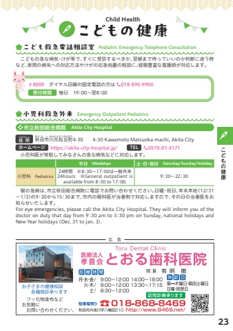 %u3000%u3053%u3069%u3082%u306e%u6025%u306a%u75c5%u6c17%u30fb%u3051%u304c%u7b49%u3067%u3001%u3059%u3050%u306b%u53d7%u8a3a%u3059%u308b%u3079%u304d%u304b%u3001%u7fcc%u671d%u307e%u3067%u5f85%u3063%u3066%u3044%u3044%u306e%u304b%u5224%u65ad%u306b%u8ff7%u3046%u6642%u306a%u3069%u3001%u591c%u9593%u306e%u75c5%u6c17%u3078%u306e%u5bfe%u5fdc%u65b9%u6cd5%u3084%u3051%u304c%u306e%u5fdc%u6025%u51e6%u7f6e%u306e%u76f8%u8ac7%u306b%u3001%u7d4c%u9a13%u8c4a%u5bcc%u306a%u770b%u8b77%u5e2b%u304c%u5bfe%u5fdc%u3057%u307e%u3059%u3002%u4f4f%u3058%u3085%u3046%u6240%u3057%u3087%u79cb%u3042%u304d%u7530%u305f%u5e02%u3057%u5ddd%u304b%u308f%u5143%u3082%u3068%u677e%u307e%u3064%u4e18%u304a%u304b%u753a%u307e%u30614-30%u3000%u30004-30KawamotoMatsuoka-machi,AkitaCity%u30db%u30fc%u30e0%u30da%u30fc%u30b8https://akita-city-hospital.jp/TEL%u260e0570-01-4171%u3000%u5c0f%u5150%u79d1%u533b%u304c%u5e38%u99d0%u3057%u3066%u307f%u306a%u3055%u3093%u306e%u6025%u306a%u75c5%u6c17%u306a%u3069%u306b%u5bfe%u5fdc%u3057%u307e%u3059%u3002%uff038000%u3000%u30c0%u30a4%u30e4%u30eb%u56de%u7dda%u306e%u56fa%u5b9a%u96fb%u8a71%u306e%u65b9%u306f%u260e018-895-9900%u53d7%u4ed8%u6642%u9593%u6bce%u65e5%u300019%uff1a00%uff5e%u7fcc8%uff1a00%u3000%u773c%u306e%u6025%u75c5%u306f%u3001%u5e02%u7acb%u79cb%u7530%u7dcf%u5408%u75c5%u9662%u306b%u96fb%u8a71%u3067%u304a%u554f%u3044%u5408%u308f%u305b%u304f%u3060%u3055%u3044%u3002%u65e5%u66dc%u30fb%u795d%u65e5%u3001%u5e74%u672b%u5e74%u59cb%uff0812/31%uff5e1/3%uff09%u306e9%uff1a30%u304b%u308915%uff1a30%u307e%u3067%u3001%u5e02%u5185%u306e%u773c%u79d1%u533b%u304c%u5f53%u756a%u5236%u3067%u5bfe%u5fdc%u3057%u307e%u3059%u306e%u3067%u3001%u305d%u306e%u65e5%u306e%u5f53%u756a%u533b%u3092%u304a%u77e5%u3089%u305b%u3044%u305f%u3057%u307e%u3059%u3002Foreyeemergencies,pleasecalltheAkitaCityHospital.Theywillinformyouofthedoctorondutythatdayfrom9%uff1a30amto3%uff1a30pmonSunday,nationalholidaysandNewYearholidays%uff08Dec.31toJan.3%uff09.%u5e73%u65e5%u3000Weekdays%u571f%u30fb%u65e5%u30fb%u795d%u65e5%u3000Saturday/Sunday/Holiday%u5c0f%u5150%u79d1%u3000Pediatrics24%u6642%u9593%u3000%u203b8%uff1a30%uff5e17%uff1a00%u306f%u4e00%u822c%u5916%u676524hours%u3000%u203bGeneraloutpatientisavailablefrom8%uff1a30to17%uff1a00.9%uff1a30%uff5e22%uff1a30%u3053%u3069%u3082%u6551%u6025%u96fb%u8a71%u76f8%u8ac7%u5ba4Pediatric Emergency Telephone Consultation%u5c0f%u5150%u79d1%u6551%u6025%u5916%u6765Emergency Outpatient Pediatrics%u5e02%u7acb%u79cb%u7530%u7dcf%u5408%u75c5%u9662%u3000Akita City Hospital%u3053%u3069%u3082%u306e%u5065%u5eb7