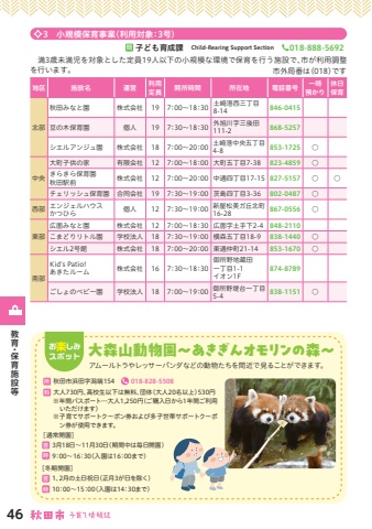 %u3000%u6e803%u6b73%u672a%u6e80%u5150%u3092%u5bfe%u8c61%u3068%u3057%u305f%u5b9a%u54e119%u4eba%u4ee5%u4e0b%u306e%u5c0f%u898f%u6a21%u306a%u74b0%u5883%u3067%u4fdd%u80b2%u3092%u884c%u3046%u65bd%u8a2d%u3067%u3001%u5e02%u304c%u5229%u7528%u8abf%u6574%u3092%u884c%u3044%u307e%u3059%u3002%u554f%u5b50%u3069%u3082%u80b2%u6210%u8ab2Child-Rearing Support Section%u260e018-888-5692%u5730%u533a%u65bd%u8a2d%u540d%u904b%u55b6%u5229%u7528%u5b9a%u54e1%u958b%u6240%u6642%u9593%u6240%u5728%u5730%u96fb%u8a71%u756a%u53f7%u4e00%u6642%u9810%u304b%u308a%u5317%u90e8%u79cb%u7530%u307f%u306a%u3068%u5712%u682a%u5f0f%u4f1a%u793e197%uff1a00%uff5e18%uff1a30%u571f%u5d0e%u6e2f%u897f%u4e09%u4e01%u76ee8-14846-0415%u8c46%u306e%u6728%u4fdd%u80b2%u5712%u500b%u4eba197%uff1a30%uff5e18%uff1a30%u5916%u65ed%u5ddd%u5b57%u4e09%u5f8c%u7530111-2868-5257%u30b7%u30a8%u30eb%u30a2%u30f3%u30b8%u30e5%u5712%u682a%u5f0f%u4f1a%u793e187%uff1a00%uff5e20%uff1a00%u571f%u5d0e%u6e2f%u4e2d%u592e%u4e94%u4e01%u76ee4-8853-1725%u4e2d%u592e%u5927%u753a%u5b50%u4f9b%u306e%u5bb6%u6709%u9650%u4f1a%u793e127%uff1a00%uff5e18%uff1a00%u5927%u753a%u4e94%u4e01%u76ee7-38823-4859%u304d%u3089%u304d%u3089%u4fdd%u80b2%u5712%u79cb%u7530%u99c5%u524d%u682a%u5f0f%u4f1a%u793e127%uff1a00%uff5e20%uff1a00%u4e2d%u901a%u56db%u4e01%u76ee17-15827-5157%u30c1%u30a7%u30ea%u30c3%u30b7%u30e5%u4fdd%u80b2%u5712%u5408%u540c%u4f1a%u793e197%uff1a30%uff5e19%uff1a00%u8328%u5cf6%u56db%u4e01%u76ee3-36802-0487%u897f%u90e8%u30a8%u30f3%u30b8%u30a7%u30eb%u30cf%u30a6%u30b9%u304b%u3064%u3072%u3089%u500b%u4eba127%uff1a30%uff5e19%uff1a00%u65b0%u5c4b%u677e%u7f8e%u30ac%u4e18%u5317%u753a16-28867-0556%u6771%u90e8%u5e83%u9762%u307f%u306a%u3068%u5712%u682a%u5f0f%u4f1a%u793e127%uff1a00%uff5e18%uff1a30%u5e83%u9762%u5b57%u571f%u624b%u4e0b2-4848-2110%u3053%u307e%u3069%u308a%u30ea%u30c8%u30eb%u5712%u5b66%u6821%u6cd5%u4eba187%uff1a30%uff5e19%uff1a00%u6a2a%u68ee%u4e94%u4e01%u76ee18-9838-1440%u30b7%u30a8%u30eb2%u53f7%u9928%u682a%u5f0f%u4f1a%u793e187%uff1a00%u301c20%uff1a00%u6771%u901a%u4ef2%u753a21-14853-1670%u5357%u90e8Kid'sPatio!%u3042%u304d%u305f%u30eb%u30fc%u30e0%u682a%u5f0f%u4f1a%u793e167%uff1a30%uff5e18%uff1a30%u5fa1%u6240%u91ce%u5730%u8535%u7530%u4e00%u4e01%u76ee1-1%u30a4%u30aa%u30f31F874-8789%u3054%u3057%u3087%u306e%u30d9%u30d3%u30fc%u5712%u5b66%u6821%u6cd5%u4eba187%uff1a00%uff5e19%uff1a00%u5fa1%u6240%u91ce%u5824%u53f0%u4e00%u4e01%u76ee5-4%u5e02%u5916%u5c40%u756a%u306f%uff08018%uff09%u3067%u3059%u304a%u697d%u3057%u307f%u30b9%u30dd%u30c3%u30c8%u5927%u68ee%u5c71%u52d5%u7269%u5712%uff5e%u3042%u304d%u304e%u3093%u30aa%u30e2%u30ea%u30f3%u306e%u68ee%uff5e%u3000%u30a2%u30e0%u30fc%u30eb%u30c8%u30e9%u3084%u30ec%u30c3%u30b5%u30fc%u30d1%u30f3%u30c0%u306a%u3069%u306e%u52d5%u7269%u305f%u3061%u3092%u9593%u8fd1%u3067%u898b%u308b%u3053%u3068%u304c%u3067%u304d%u307e%u3059%u3002%u6240%u79cb%u7530%u5e02%u6d5c%u7530%u5b57%u6f5f%u7aef154%uff3b%u901a%u5e38%u958b%u5712%uff3d%u55b63%u670818%u65e5%uff5e11%u670830%u65e5%uff08%u671f%u9593%u4e2d%u306f%u6bce%u65e5%u958b%u5712%uff09%u66429%uff1a00%uff5e16%uff1a30%uff08%u5165%u5712%u306f16%uff1a00%u307e%u3067%uff09%uff3b%u51ac%u671f%u958b%u5712%uff3d%u55b61%u30012%u6708%u306e%u571f%u65e5%u795d%u65e5%uff08%u6b63%u67083%u304c%u65e5%u3092%u9664%u304f%uff09%u664210%uff1a00%uff5e15%uff1a00%uff08%u5165%u5712%u306f14%uff1a30%u307e%u3067%uff09%u6599%u5927%u4eba730%u5186%u3001%u9ad8%u6821%u751f%u4ee5%u4e0b%u306f%u7121%u6599%u3001%u56e3%u4f53%uff08%u5927%u4eba20%u540d%u4ee5%u4e0a%uff09530%u5186%u203b%u5e74%u9593%u30d1%u30b9%u30dd%u30fc%u30c8%u2026%u5927%u4eba1,250%u5186%uff08%u3054%u8cfc%u5165%u65e5%u304b%u30891%u5e74%u9593%u3054%u5229%u7528%u3000%u3044%u305f%u3060%u3051%u307e%u3059%uff09%u203b%u5b50%u80b2%u3066%u30b5%u30dd%u30fc%u30c8%u30af%u30fc%u30dd%u30f3%u5238%u304a%u3088%u3073%u591a%u5b50%u4e16%u5e2f%u30b5%u30dd%u30fc%u30c8%u30af%u30fc%u30dd%u3000%u30f3%u5238%u304c%u4f7f%u7528%u3067%u304d%u307e%u3059%u3002018-828-5508%u6559%u80b2 %u30fb %u4fdd%u80b2%u65bd%u8a2d%u7b4946