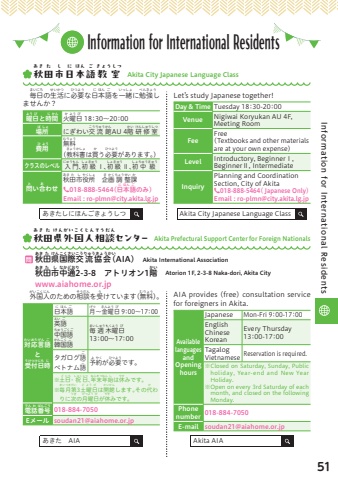 %u6bceLet%u2019sstudyJapanesetogether!%u307e%u3044%u65e5%u306b%u3061%u306e%u751f%u305b%u3044%u6d3b%u304b%u3064%u306b%u5fc5%u3072%u3064%u8981%u3088%u3046%u306a%u65e5%u306b%u672c%u307b%u3093%u8a9e%u3054%u3092%u3044%u3063%u7dd2%u3057%u3087%u306b%u52c9%u3079%u3093%u5f37%u304d%u3087%u3046%u3057%u307e%u305b%u3093%u304b%uff1f%u3042%u304d%u305f%u3057%u306b%u307b%u3093%u3054%u304d%u3087%u3046%u3057%u3064AkitaCityJapaneseLanguageClass%u3042%u304d%u305f%u3000AIAAkitaAIA%u66dc%u3088%u3046%u65e5%u3073%u3068%u6642%u3058%u9593%u304b%u3093%u706b%u304b%u66dc%u3088%u3046%u65e5%u307318%uff1a30%uff5e20%uff1a00%u5834%u3070%u6240%u3057%u3087%u306b%u304e%u308f%u3044%u4ea4%u3053%u3046%u6d41%u308a%u3085%u3046%u9928%u304b%u3093AU4%u968e%u304b%u3044%u7814%u3051%u3093%u4fee%u3057%u3085%u3046%u5ba4%u3057%u3064%u8cbb%u3072%u7528%u3088%u3046%u7121%u3080%u308a%u6599%u3087%u3046%uff08%u6559%u304d%u3087%u3046%u304b%u3057%u3087%u79d1%u66f8%u306f%u8cb7%u304b%u3046%u5fc5%u3072%u3064%u8981%u3088%u3046%u304c%u3042%u308a%u307e%u3059%u3002%uff09%u30af%u30e9%u30b9%u306e%u30ec%u30d9%u30eb%u5165%u306b%u3085%u3046%u9580%u3082%u3093%u3001%u521d%u3057%u3087%u7d1a%u304d%u3085%u3046%u2160%u3001%u521d%u3057%u3087%u7d1a%u304d%u3085%u3046%u2161%u3001%u521d%u3057%u3087%u4e2d%u3061%u3085%u3046%u7d1a%u304d%u3085%u3046%u554f%u3068%u3044%u5408%u3042%u308f%u305b%u79cb%u3042%u304d%u7530%u305f%u5e02%u3057%u5f79%u3084%u304f%u6240%u3057%u3087%u4f01%u304d%u753b%u304b%u304f%u8abf%u3061%u3087%u3046%u6574%u305b%u3044%u8ab2%u304b%u260e018-888-5464%uff08%u65e5%u306b%u672c%u307b%u3093%u8a9e%u3054%u306e%u307f%uff09Email : ro-plmn@city.akita.lg.jpDay & TimeTuesday18%uff1a30-20%uff1a00VenueNigiwaiKoryukanAU4F,MeetingRoomFeeFree%uff08Textbooksandothermaterialsareatyourownexpense%uff09LevelIntroductory,Beginner%u2160,Beginner%u2161,IntermediateInquiryPlanningandCoordinationSection,CityofAkita%u260e018-888-5464%uff08 Japanese Only%uff09Email : ro-plmn@city.akita.lg.jp%u79cb%u3042%u304d%u7530%u305f%u5e02%u3057%u65e5%u306b%u672c%u307b%u3093%u8a9e%u3054%u6559%u304d%u3087%u3046%u3057%u3064%u5ba4Akita City Japanese Language Class%u5916%u304c%u3044%u56fd%u3053%u304f%u4eba%u3058%u3093%u306e%u305f%u3081%u306e%u76f8%u305d%u3046%u8ac7%u3060%u3093%u3092%u53d7%u3046%u3051%u3066%u3044%u307e%u3059%uff08%u7121%u3080%u308a%u3087%u3046%u6599%uff09%u3002%u5bfe%u305f%u3044%u5fdc%u304a%u3046%u8a00%u3052%u3093%u8a9e%u3054%u3068%u53d7%u3046%u3051%u4ed8%u3064%u3051%u65e5%u306b%u3061%u6642%u3058%u65e5%u306b%u672c%u307b%u3093%u8a9e%u3054%u6708%u3052%u3064%uff5e%u91d1%u304d%u3093%u66dc%u3088%u3046%u65e5%u30739%uff1a00%uff5e17%uff1a00%u82f1%u3048%u3044%u8a9e%u3054%u4e2d%u3061%u3085%u3046%u3054%u304f%u3054%u56fd%u8a9e%u97d3%u304b%u3093%u56fd%u3053%u304f%u8a9e%u3054%u6bce%u307e%u3044%u9031%u3057%u3085%u3046%u6728%u3082%u304f%u66dc%u3088%u3046%u65e5%u307313%uff1a00%uff5e17%uff1a00%u30bf%u30ac%u30ed%u30b0%u8a9e%u3054%u30d9%u30c8%u30ca%u30e0%u8a9e%u3054%u4e88%u3088%u7d04%u3084%u304f%u304c%u5fc5%u3072%u3064%u8981%u3088%u3046%u3067%u3059%u3002%u203b%u571f%u3069%u65e5%u306b%u3061%u30fb%u795d%u3057%u3085%u304f%u65e5%u3058%u3064%u3001%u5e74%u306d%u3093%u672b%u307e%u3064%u5e74%u306d%u3093%u59cb%u3057%u306f%u4f11%u3084%u3059%u307f%u3067%u3059%u3002%u203b%u0007%u6bce%u307e%u3044%u6708%u3064%u304d%u7b2c%u3060%u30443%u571f%u3069%u66dc%u3088%u3046%u65e5%u3073%u306f%u958b%u304b%u3044%u9928%u304b%u3093%u3057%u307e%u3059%u3002%u305d%u306e%u4ee3%u304b%u308f%u308a%u306b%u6b21%u3064%u304e%u306e%u6708%u3052%u3064%u66dc%u3088%u3046%u65e5%u3073%u304c%u4f11%u3084%u3059%u307f%u3067%u3059%u3002%u96fb%u3067%u3093%u8a71%u308f%u756a%u3070%u3093%u53f7%u3054%u3046018-884-7050E%u30e1%u30fc%u30ebsoudan21@aiahome.or.jpAIAprovides%uff08free%uff09consultationserviceforforeignersinAkita.%u554f%u79cb%u3042%u304d%u7530%u305f%u770c%u3051%u3093%u56fd%u3053%u304f%u969b%u3055%u3044%u4ea4%u3053%u3046%u308a%u3085%u3046%u304d%u3087%u3046%u304b%u3044%u6d41%u5354%u4f1a%uff08AIA%uff09%u3000Akita International Association%u79cb%u3042%u304d%u7530%u305f%u5e02%u3057%u4e2d%u306a%u304b%u901a%u3069%u304a%u308a2-3-8%u3000%u30a2%u30c8%u30ea%u30aa%u30f31%u968e%u304b%u3044Atorion 1F, 2-3-8 Naka-dori, Akita Citywww.aiahome.or.jpAvailablelanguagesandOpeninghoursJapaneseMon-Fri9%uff1a00-17%uff1a00EnglishChineseKoreanEveryThursday13%uff1a00-17%uff1a00TagalogVietnameseReservationisrequired.%u203b%u0007ClosedonSaturday,Sunday,Publicholiday,Year-endandNewYearHoliday.%u203b%u0007Openonevery3rdSaturdayofeachmonth,andclosedonthefollowingMonday.Phonenumber018-884-7050E-mailsoudan21@aiahome.or.jp%u79cb%u3042%u304d%u7530%u305f%u770c%u3051%u3093%u5916%u304c%u3044%u56fd%u3053%u304f%u4eba%u3058%u3093%u76f8%u305d%u3046%u8ac7%u3060%u3093%u30bb%u30f3%u30bf%u30fcAkita Prefectural Support Center for Foreign NationalsInformation for International Residents