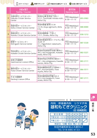 %u624b%u7d9a%u304d%u7a93%u53e3Facility / Counter%u4f4f%u6240Address%u53d7%u4ed8%u65e5%u6642Opening hoursTEL6%u5317%u307b%u304f%u90e8%u3076%u5e02%u3057%u6c11%u307f%u3093%u30b5%u30fc%u30d3%u30b9%u30bb%u30f3%u30bf%u30fcHokubuCitizenServiceCenter%u79cb%u3042%u304d%u7530%u305f%u5e02%u3057%u571f%u3064%u3061%u5d0e%u3056%u304d%u6e2f%u307f%u306a%u3068%u897f%u306b%u3057%u4e94%u3054%u3061%u3087%u3046%u3081%u4e01%u76ee3-15-3-1,Tsuchizakiminatonishi,AkitaCity%u5e73%u3078%u3044%u65e5%u3058%u3064%uff08Weekdays%uff098%uff1a30%uff5e17%uff1a15893-59837%u897f%u305b%u3044%u90e8%u3076%u5e02%u3057%u6c11%u307f%u3093%u30b5%u30fc%u30d3%u30b9%u30bb%u30f3%u30bf%u30fcSeibuCitizenServiceCenter%u79cb%u3042%u304d%u7530%u305f%u5e02%u3057%u65b0%u3042%u3089%u5c4b%u3084%u6247%u304a%u3046%u304e%u753a%u307e%u306113-3413-34,Arayaogimachi,AkitaCity%u5e73%u3078%u3044%u65e5%u3058%u3064%uff08Weekdays%uff098%uff1a30%uff5e17%uff1a15888-80808%u5357%u306a%u3093%u90e8%u3076%u5e02%u3057%u6c11%u307f%u3093%u30b5%u30fc%u30d3%u30b9%u30bb%u30f3%u30bf%u30fcNambuCitizenServiceCenter%u79cb%u3042%u304d%u7530%u305f%u5e02%u3057%u5fa1%u304a%u91ce%u306e%u5834%u3070%u3044%u3063%u3061%u3087%u3046%u3081%u4e01%u76ee5-11-5-1,Onoba,AkitaCity%u5e73%u3078%u3044%u65e5%u3058%u3064%uff08Weekdays%uff098%uff1a30%uff5e17%uff1a15838-12129%u99c5%u3048%u304d%u6771%u3072%u304c%u3057%u30b5%u30fc%u30d3%u30b9%u30bb%u30f3%u30bf%u30fcEkihigashiServiceCenter%u79cb%u3042%u304d%u7530%u305f%u5e02%u3057%u6771%u3072%u304c%u3057%u3069%u304a%u308a%u306a%u304b%u307e%u3061%u901a%u4ef2%u753a4-1%u30a2%u30eb%u30f4%u30a71%u968e%u304b%u3044ALVE1F4-1,Higashidorinakamachi,AkitaCity%u5e73%u3078%u3044%u65e5%u3058%u3064%uff08Weekdays%uff099%uff1a00%uff5e17%uff1a15887-532010%u6cb3%u304b%u308f%u8fba%u3079%u5e02%u3057%u6c11%u307f%u3093%u30b5%u30fc%u30d3%u30b9%u30bb%u30f3%u30bf%u30fcKawabeCitizenServiceCenter%u79cb%u3042%u304d%u7530%u305f%u5e02%u3057%u6cb3%u304b%u308f%u8fba%u3079%u548c%u308f%u7530%u3060%u5b57%u3042%u3056%u5317%u307b%u3046%u3058%u3087%u3046%u304c%u3055%u304d%u57ce%u30b1%u5d0e38-238-2,Azahojogasaki,Kawabewada,AkitaCity%u5e73%u3078%u3044%u65e5%u3058%u3064%uff08Weekdays%uff098%uff1a30%uff5e17%uff1a15882-522111%u5ca9%u3044%u308f%u898b%u307f%u4e09%u3055%u3093%u5185%u306a%u3044%u9023%u308c%u3093%u7d61%u3089%u304f%u6240%u3057%u3087IwamisannaiLiaisonOffice%u79cb%u3042%u304d%u7530%u305f%u5e02%u3057%u6cb3%u304b%u308f%u8fba%u3079%u4e09%u3055%u3093%u5185%u306a%u3044%u5b57%u3042%u3056%u5916%u305d%u3068%u5ddd%u304c%u308f%u539f34-134-1,Azasotogawara,Kawabesannai,AkitaCity%u5e73%u3078%u3044%u65e5%u3058%u3064%uff08Weekdays%uff098%uff1a30%uff5e17%uff1a1512%u96c4%u3086%u3046%u548c%u308f%u5e02%u3057%u6c11%u307f%u3093%u30b5%u30fc%u30d3%u30b9%u30bb%u30f3%u30bf%u30fcYuwaCitizenServiceCenter%u79cb%u3042%u304d%u7530%u305f%u5e02%u3057%u96c4%u3086%u3046%u308f%u307f%u3087%u3046%u307b%u3046%u3042%u3056%u548c%u5999%u6cd5%u5b57%u4e0a%u304b%u307f%u5927%u3060%u3044%u90e848-148-1,Azakamidaibu,Yuwamyoho,AkitaCity%u5e73%u3078%u3044%u65e5%u3058%u3064%uff08Weekdays%uff098%uff1a30%uff5e17%uff1a1513%u5927%u3060%u3044%u6b63%u3057%u3087%u3046%u5bfa%u3058%u9023%u308c%u3093%u7d61%u3089%u304f%u6240%u3057%u3087DaishojiLiaisonOffice%u79cb%u3042%u304d%u7530%u305f%u5e02%u3057%u96c4%u3086%u3046%u548c%u308f%u65b0%u3042%u3089%u6ce2%u308f%u5b57%u3042%u3056%u6a0b%u3068%u308862-262-2,Azatoyoguchi,Yuwaarawa,AkitaCity%u5e73%u3078%u3044%u65e5%u3058%u3064%uff08Weekdays%uff098%uff1a30%uff5e17%uff1a15
