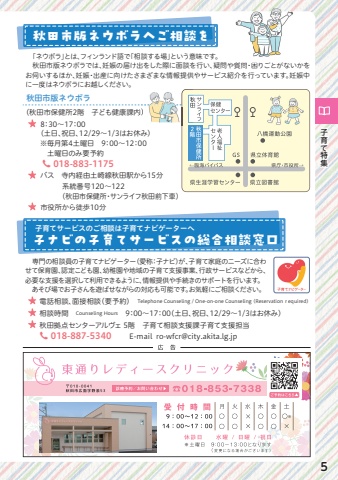%u96fb%u8a71%u76f8%u8ac7%u3001%u9762%u63a5%u76f8%u8ac7%uff08%u8981%u4e88%u7d04%uff09%u3000Telephone Counseling / One-on-one Counseling (Reservation %uff52equired)%u76f8%u8ac7%u6642%u9593%u3000Counseling Hours%u30009%uff1a00%uff5e17%uff1a00%uff08%u571f%u65e5%u3001%u795d%u65e5%u300112/29%uff5e1/3%u306f%u304a%u4f11%u307f%uff09%u79cb%u7530%u62e0%u70b9%u30bb%u30f3%u30bf%u30fc%u30a2%u30eb%u30f4%u30a7 5%u968e%u3000%u5b50%u80b2%u3066%u76f8%u8ac7%u652f%u63f4%u8ab2%u5b50%u80b2%u3066%u652f%u63f4%u62c5%u5f53%u260e 018-887-5340%u3000%u3000E-mail ro-wfcr@city.akita.lg.jp%u3000%u300c%u30cd%u30a6%u30dc%u30e9%u300d%u3068%u306f%u3001%u30d5%u30a3%u30f3%u30e9%u30f3%u30c9%u8a9e%u3067%u300c%u76f8%u8ac7%u3059%u308b%u5834%u300d%u3068%u3044%u3046%u610f%u5473%u3067%u3059%u3002%u3000%u79cb%u7530%u5e02%u7248%u30cd%u30a6%u30dc%u30e9%u3067%u306f%u3001%u598a%u5a20%u306e%u5c4a%u3051%u51fa%u3092%u3057%u305f%u969b%u306b%u9762%u8ac7%u3092%u884c%u3044%u3001%u7591%u554f%u3084%u8cea%u554f%u30fb%u56f0%u308a%u3054%u3068%u304c%u306a%u3044%u304b%u3092%u304a%u4f3a%u3044%u3059%u308b%u307b%u304b%u3001%u598a%u5a20%u30fb%u51fa%u7523%u306b%u5411%u3051%u305f%u3055%u307e%u3056%u307e%u306a%u60c5%u5831%u63d0%u4f9b%u3084%u30b5%u30fc%u30d3%u30b9%u7d39%u4ecb%u3092%u884c%u3063%u3066%u3044%u307e%u3059%u3002%u598a%u5a20%u4e2d%u306b%u4e00%u5ea6%u306f%u30cd%u30a6%u30dc%u30e9%u306b%u304a%u8d8a%u3057%u304f%u3060%u3055%u3044%u3002%u3000%u5c02%u9580%u306e%u76f8%u8ac7%u54e1%u306e%u5b50%u80b2%u3066%u30ca%u30d3%u30b2%u30fc%u30bf%u30fc%uff08%u611b%u79f0%uff1a%u5b50%u30ca%u30d3%uff09%u304c%u3001%u5b50%u80b2%u3066%u5bb6%u5ead%u306e%u30cb%u30fc%u30ba%u306b%u5408%u308f%u305b%u3066%u4fdd%u80b2%u5712%u3001%u8a8d%u5b9a%u3053%u3069%u3082%u5712%u3001%u5e7c%u7a1a%u5712%u3084%u5730%u57df%u306e%u5b50%u80b2%u3066%u652f%u63f4%u4e8b%u696d%u3001%u884c%u653f%u30b5%u30fc%u30d3%u30b9%u306a%u3069%u304b%u3089%u3001%u5fc5%u8981%u306a%u652f%u63f4%u3092%u9078%u629e%u3057%u3066%u5229%u7528%u3067%u304d%u308b%u3088%u3046%u306b%u3001%u60c5%u5831%u63d0%u4f9b%u3084%u624b%u7d9a%u304d%u306e%u30b5%u30dd%u30fc%u30c8%u3092%u884c%u3044%u307e%u3059%u3002%u3000%u3042%u305d%u3073%u5834%u3067%u304a%u5b50%u3055%u3093%u3092%u904a%u3070%u305b%u306a%u304c%u3089%u306e%u5bfe%u5fdc%u3082%u53ef%u80fd%u3067%u3059%u3002%u304a%u6c17%u8efd%u306b%u3054%u76f8%u8ac7%u304f%u3060%u3055%u3044%u3002%u79cb%u7530%u5e02%u7248%u30cd%u30a6%u30dc%u30e9%uff08%u79cb%u7530%u5e02%u4fdd%u5065%u62402%u968e%u3000%u5b50%u3069%u3082%u5065%u5eb7%u8ab2%u5185%uff09%u260e 018-883-1175%u30d0%u30b9%u3000%u5bfa%u5185%u7d4c%u7531%u571f%u5d0e%u7dda%u79cb%u7530%u99c5%u304b%u308915%u5206%u3000%u3000%u3000%u7cfb%u7d71%u756a%u53f7120%uff5e122%uff08%u79cb%u7530%u5e02%u4fdd%u5065%u6240%u30fb%u30b5%u30f3%u30e9%u30a4%u30d5%u79cb%u7530%u524d%u4e0b%u8eca%uff09%u5e02%u5f79%u6240%u304b%u3089%u5f92%u6b6910%u5206%u79cb%u7530%u5e02%u7248%u30cd%u30a6%u30dc%u30e9%u3078%u3054%u76f8%u8ac7%u3092%u5b50%u30ca%u30d3%u306e%u5b50%u80b2%u3066%u30b5%u30fc%u30d3%u30b9%u306e%u7dcf%u5408%u76f8%u8ac7%u7a93%u53e3%u3000%u79cb%u7530%u5e02%u7248%u30cd%u30a6%u30dc%u30e9%u3067%u306f%u3001%u598a%u5a20%u306e%u5c4a%u3051%u51fa%u3092%u3057%u305f%u969b%u306b%u9762%u8ac7%u3092%u884c%u3044%u3001%u7591%u554f%u3084%u8cea%u554f%u30fb%u56f0%u308a%u3054%u3068%u304c%u306a%u3044%u304b%u3092%u5b50%u80b2%u3066%u30b5%u30fc%u30d3%u30b9%u306e%u3054%u76f8%u8ac7%u306f%u5b50%u80b2%u3066%u30ca%u30d3%u30b2%u30fc%u30bf%u30fc%u3078%uff08%u79cb%u7530%u5e02%u4fdd%u5065%u62402%u968e%u3000%u5b50%u3069%u3082%u5065%u5eb7%u8ab2%u5185%uff098%uff1a30%uff5e17%uff1a00%uff08%u571f%u65e5%u3001%u795d%u65e5%u300112/29%uff5e1/3%u306f%u304a%u4f11%u307f%uff09%u203b%u6bce%u6708%u7b2c4%u571f%u66dc%u65e5%u30009%uff1a00%uff5e12%uff1a00%u571f%u66dc%u65e5%u306e%u307f%u8981%u4e88%u7d04