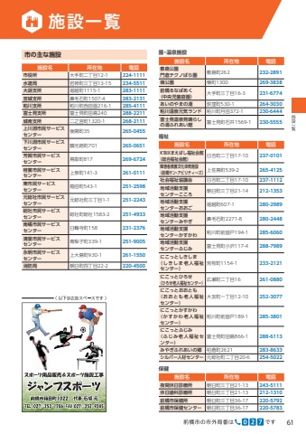 %u65bd%u8a2d%u540d%u6240%u5728%u5730%u5e02%u5f79%u6240%u5927%u624b%u753a%u4e8c%u4e01%u76ee12-1224-1111%u6c34%u9053%u5c40%u5ca9%u795e%u753a%u4e09%u4e01%u76ee13-15234-5511%u5927%u80e1%u652f%u6240%u5800%u8d8a%u753a1115-1283-1111%u5bae%u57ce%u652f%u6240%u9f3b%u6bdb%u77f3%u753a1507-4283-2131%u7c95%u5ddd%u652f%u6240%u7c95%u5ddd%u753a%u897f%u7530%u9762216-1285-4111%u5bcc%u58eb%u898b%u652f%u6240%u5bcc%u58eb%u898b%u753a%u7530%u5cf6240288-2211%u57ce%u5357%u652f%u6240%u4e8c%u4e4b%u5bae%u753a1320-1268-2111%u4e0a%u5ddd%u6df5%u5e02%u6c11%u30b5%u30fc%u30d3%u30b9%u30bb%u30f3%u30bf%u30fc%u5f8c%u9591%u753a35265-0455%u4e0b%u5ddd%u6df5%u5e02%u6c11%u30b5%u30fc%u30d3%u30b9%u30bb%u30f3%u30bf%u30fc%u9db4%u5149%u8def%u753a701265-0651%u82b3%u8cc0%u5e02%u6c11%u30b5%u30fc%u30d3%u30b9%u30bb%u30f3%u30bf%u30fc%u9ce5%u53d6%u753a817269-6724%u6842%u8431%u5e02%u6c11%u30b5%u30fc%u30d3%u30b9%u30bb%u30f3%u30bf%u30fc%u4e0a%u6cc9%u753a141-3261-0111%u6771%u5e02%u6c11%u30b5%u30fc%u30d3%u30b9%u30bb%u30f3%u30bf%u30fc%u7bb1%u7530%u753a543-1251-2598%u5143%u7dcf%u793e%u5e02%u6c11%u30b5%u30fc%u30d3%u30b9%u30bb%u30f3%u30bf%u30fc%u5143%u7dcf%u793e%u753a%u4e09%u4e01%u76ee1-1251-2243%u7dcf%u793e%u5e02%u6c11%u30b5%u30fc%u30d3%u30b9%u30bb%u30f3%u30bf%u30fc%u7dcf%u793e%u753a%u7dcf%u793e1583-2251-4933%u5357%u6a58%u5e02%u6c11%u30b5%u30fc%u30d3%u30b9%u30bb%u30f3%u30bf%u30fc%u65e5%u8f2a%u5bfa%u753a158231-2376%u30bb%u30f3%u30bf%u30fc%u9752%u68a8%u5b50%u753a339-1251-9005%u6c38%u660e%u5e02%u6c11%u30b5%u30fc%u30d3%u30b9%u30bb%u30f3%u30bf%u30fc%u4e0a%u5927%u5cf6%u753a930-1261-1550%u6d88%u9632%u5c40%u671d%u65e5%u753a%u56db%u4e01%u76ee22-2220-4500%u5e02%u306e%u4e3b%u306a%u65bd%u8a2d%u5712%u30fb%u6e29%u6cc9%u65bd%u8a2d%u65bd%u8a2d%u540d%u6240%u5728%u5730%u6577%u5cf6%u516c%u5712%u9580%u5009%u30c6%u30af%u30ce%u3070%u3089%u5712%u6577%u5cf6%u753a262232-2891%u5dba%u516c%u5712%u5dba%u753a1300269-3838%u524d%u6a4b%u308b%u306a%u3071%u3042%u304f%uff08%u4e2d%u592e%u5150%u7ae5%u904a%u5712%uff09%u5927%u624b%u753a%u4e09%u4e01%u76ee16-3231-6774%u3042%u3044%u306e%u3084%u307e%u306e%u6e6f%u837b%u7aaa%u753a530-1264-3030%u7c95%u5ddd%u6e29%u6cc9%u5143%u6c17%u30e9%u30f3%u30c9%u7c95%u5ddd%u753a%u6708%u7530372-1230-6444%u5bcc%u58eb%u898b%u6e29%u6cc9%u898b%u6674%u3089%u3057%u306e%u6e6f%u3075%u308c%u3042%u3044%u9928%u5bcc%u58eb%u898b%u753a%u77f3%u4e951569-1230-5555%u65bd%u8a2d%u540d%u6240%u5728%u5730K'BIX%u307e%u3048%u3070%u3057%u798f%u7949%u4f1a%u9928%uff08%u7dcf%u5408%u798f%u7949%u4f1a%u9928%uff09%u65e5%u5409%u753a%u4e8c%u4e01%u76ee17-10237-0101%u969c%u5bb3%u8005%u6559%u990a%u6587%u5316%u4f53%u80b2%u65bd%u8a2d%uff08%u524d%u6a4b%u30b5%u30f3%u30fb%u30a2%u30d3%u30ea%u30c6%u30a3%u30fc%u30ba%uff09%u4e0a%u4f50%u9ce5%u753a539-2265-4125%u793e%u4f1a%u798f%u7949%u5354%u8b70%u4f1a%u65e5%u5409%u753a%u4e8c%u4e01%u76ee17-10237-1112%u5730%u57df%u6d3b%u52d5%u652f%u63f4%u30bb%u30f3%u30bf%u30fc%u3053%u3053%u308d%u671d%u65e5%u753a%u4e09%u4e01%u76ee21-14212-1353%u5730%u57df%u6d3b%u52d5%u652f%u63f4%u30bb%u30f3%u30bf%u30fc%u304a%u304a%u3054%u5800%u8d8a%u753a607-1280-2989%u5730%u57df%u6d3b%u52d5%u652f%u63f4%u30bb%u30f3%u30bf%u30fc%u307f%u3084%u304e%u9f3b%u6bdb%u77f3%u753a2271-8280-2448%u5730%u57df%u6d3b%u52d5%u652f%u63f4%u30bb%u30f3%u30bf%u30fc%u304b%u3059%u304b%u308f%u7c95%u5ddd%u753a%u524d%u7686%u6238194-1285-6060%u5730%u57df%u6d3b%u52d5%u652f%u63f4%u30bb%u30f3%u30bf%u30fc%u3075%u3058%u307f%u5bcc%u58eb%u898b%u753a%u5c0f%u6ca2117-4288-7989%u306b%u3053%u3063%u3068%u3057%u304d%u3057%u307e%uff08%u3057%u304d%u3057%u307e%u8001%u4eba%u798f%u7949%u30bb%u30f3%u30bf%u30fc%uff09%u8352%u7267%u753a1154-1233-2121%u306b%u3053%u3063%u3068%u3072%u308d%u305b%uff08%u3072%u308d%u305b%u8001%u4eba%u798f%u7949%u30bb%u30f3%u30bf%u30fc%uff09%u5e83%u702c%u753a%u4e8c%u4e01%u76ee16261-0880%u306b%u3053%u3063%u3068%u304a%u304a%u3068%u3082%uff08%u304a%u304a%u3068%u3082%u8001%u4eba%u798f%u7949%u30bb%u30f3%u30bf%u30fc%uff09%u5927%u53cb%u753a%u4e00%u4e01%u76ee12-10252-3077%u306b%u3053%u3063%u3068%u304b%u3059%u304b%u308f%uff08%u304b%u3059%u304b%u308f%u8001%u4eba%u798f%u7949%u30bb%u30f3%u30bf%u30fc%uff09%u7c95%u5ddd%u753a%u524d%u7686%u6238189-1285-3801%u306b%u3053%u3063%u3068%u3075%u3058%u307f%uff08%u3075%u3058%u307f%u8001%u4eba%u798f%u7949%u30bb%u30f3%u30bf%u30fc%uff09%u5bcc%u58eb%u898b%u753a%u7530%u5cf6866-1288-6113%u307f%u3084%u304e%u3075%u308c%u3042%u3044%u306e%u90f7%u67cf%u5009%u753a2621283-8633%u30b7%u30eb%u30d0%u30fc%u4eba%u6750%u30bb%u30f3%u30bf%u30fc%u5143%u7dcf%u793e%u753a%u4e8c%u4e01%u76ee20-6254-5022%u798f%u7949%u65bd%u8a2d%u540d%u6240%u5728%u5730%u591c%u9593%u4f11%u65e5%u8a3a%u7642%u6240%u671d%u65e5%u753a%u4e09%u4e01%u76ee21-13243-5111%u4f11%u65e5%u6b6f%u79d1%u8a3a%u7642%u6240%u671d%u65e5%u753a%u4e09%u4e01%u76ee21-13212-1310%u524d%u6a4b%u5e02%u4fdd%u5065%u6240%u671d%u65e5%u753a%u4e09%u4e01%u76ee36-17220-5792%u524d%u6a4b%u5e02%u4fdd%u5065%u30bb%u30f3%u30bf%u30fc%u671d%u65e5%u753a%u4e09%u4e01%u76ee36-17220-5783%u4fdd%u5065