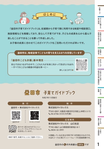 %u898b%u3084%u3059%u304f%u8aad%u307f%u307e%u3061%u304c%u3048%u306b%u304f%u3044%u30e6%u30cb%u30d0%u30fc%u30b5%u30eb%u30c7%u30b6%u30a4%u30f3%u30d5%u30a9%u30f3%u30c8%u3092%u63a1%u7528%u3057%u3066%u3044%u307e%u3059%u3002%u3000%u300c%u76ca%u7530%u5e02%u5b50%u80b2%u3066%u30ac%u30a4%u30c9%u30d6%u30c3%u30af%u300d%u306f%u3001%u598a%u5a20%u671f%u304b%u3089%u5b50%u80b2%u3066%u671f%u306b%u5229%u7528%u3067%u304d%u308b%u5236%u5ea6%u3084%u76f8%u8ac7%u7a93%u53e3%u3001%u65bd%u8a2d%u60c5%u5831%u306a%u3069%u3092%u63b2%u8f09%u3057%u3066%u304a%u308a%u3001%u5b89%u5fc3%u3057%u3066%u5b50%u80b2%u3066%u304c%u3067%u304d%u3001%u5b50%u3069%u3082%u306e%u6210%u9577%u3092%u5fc3%u304b%u3089%u559c%u3093%u3067%u697d%u3057%u3080%u3053%u3068%u304c%u3067%u304d%u308b%u3053%u3068%u3092%u9858%u3063%u3066%u4f5c%u6210%u3057%u307e%u3057%u305f%u3002%u3000%u304a%u5b50%u69d8%u306e%u6210%u9577%u306b%u5408%u308f%u305b%u3066%u3053%u306e%u30ac%u30a4%u30c9%u30d6%u30c3%u30af%u3092%u3054%u6d3b%u7528%u3044%u305f%u3060%u3051%u308c%u3070%u5e78%u3044%u3067%u3059%u3002%u767a%u3000%u884c%u203b%u63b2%u8f09%u3057%u3066%u3044%u308b%u5e83%u544a%u306f%u4ee4%u548c7%u5e7410%u6708%u73fe%u5728%u306e%u3082%u306e%u3067%u3059%u3002%u203bQR%u30b3%u30fc%u30c9%u306f%uff08%u682a%uff09%u30c7%u30f3%u30bd%u30fc%u30a6%u30a7%u30fc%u30d6%u306e%u767b%u9332%u5546%u6a19%u3067%u3059%u3002%u682a%u5f0f%u4f1a%u793e%u30b5%u30a4%u30cd%u30c3%u30af%u30b9%u3012543-0001 %u5927%u962a%u5e9c%u5927%u962a%u5e02%u5929%u738b%u5bfa%u533a%u4e0a%u672c%u753a5-3-15%u260e 06-6766-3333(%u5927%u4ee3%u8868)%u682a%u5f0f%u4f1a%u793e%u30b5%u30a4%u30cd%u30c3%u30af%u30b9%u3000%u5c71%u53e3%u652f%u5e97%u3012745-0861 %u5c71%u53e3%u770c%u5468%u5357%u5e02%u65b0%u57302-8-1%u260e 0834-32-3991%u5e83%u544a%u8ca9%u58f2%u7121%u65ad%u3067%u8907%u5199%u3001%u8ee2%u8f09%u3059%u308b%u3053%u3068%u306f%u3054%u9060%u616e%u304f%u3060%u3055%u3044%u3002%u76ca%u7530%u5e02 %u00d7 %u682a%u5f0f%u4f1a%u793e%u30b5%u30a4%u30cd%u30c3%u30af%u30b9%u76ca%u7530%u5e02HP%u30b5%u30a4%u30cd%u30c3%u30af%u30b9HP%u4ee4%u548c7%u5e7411%u6708%u767a%u884c%u306f%u3058%u3081%u306b%u76ca%u7530%u5e02%u306f%u3001%u5730%u57df%u5168%u4f53%u3067%u3053%u3069%u3082%u306e%u80b2%u3061%u3092%u652f%u3048%u308b%u307e%u3061%u3092%u76ee%u6307%u3057%u3066%u3044%u307e%u3059%u5b89%u5fc3%u3067%u304d%u308b%u3064%u306a%u304c%u308a%u306e%u4e2d%u3067%u3001%u3053%u3069%u3082%u305f%u3061%u304c%u672a%u6765%u306b%u5411%u304b%u3063%u3066%u7fbd%u3070%u305f%u3051%u308b%u307e%u3061%uff5e%u3059%u3079%u3066%u306e%u3053%u3069%u3082%u306e%u6700%u5584%u306e%u5229%u76ca%u3092%u7b2c%u4e00%u306b%uff5e%u8a73%u3057%u304f%u306f%u30b3%u30c1%u30e9%u300c%u76ca%u7530%u5e02%u3053%u3069%u3082%u8a08%u753b%u300d%u57fa%u672c%u7406%u5ff5