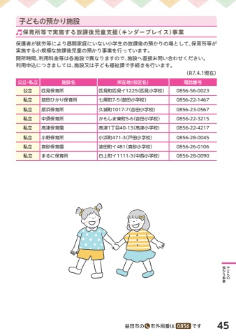 %u516c%u7acb%u30fb%u79c1%u7acb%u65bd%u8a2d%u540d%u6240%u5728%u5730%uff08%u6821%u533a%u540d%uff09%u96fb%u8a71%u756a%u53f7%u516c%u7acb%u5339%u898b%u4fdd%u80b2%u6240%u5339%u898b%u753a%u5339%u898b%u30a41225%uff08%u5339%u898b%u5c0f%u5b66%u6821%uff090856-56-0023%u79c1%u7acb%u76ca%u7530%u3072%u304b%u308a%u4fdd%u80b2%u6240%u4e03%u5c3e%u753a7-5%uff08%u76ca%u7530%u5c0f%u5b66%u6821%uff090856-22-1467%u79c1%u7acb%u539f%u6d5c%u4fdd%u80b2%u6240%u4e45%u57ce%u753a1017-7%uff08%u5409%u7530%u5c0f%u5b66%u6821%uff090856-23-0567%u79c1%u7acb%u4e2d%u9808%u4fdd%u80b2%u6240%u304b%u3082%u3057%u307e%u6771%u753a5-6%uff08%u5409%u7530%u5c0f%u5b66%u6821%uff090856-22-3215%u79c1%u7acb%u9ad8%u6d25%u4fdd%u80b2%u5712%u9ad8%u6d251%u4e01%u76ee40-13%uff08%u9ad8%u6d25%u5c0f%u5b66%u6821%uff090856-22-4217%u79c1%u7acb%u5c0f%u91ce%u4fdd%u80b2%u6240%u5c0f%u6d5c%u753a471-3%uff08%u6238%u7530%u5c0f%u5b66%u6821%uff090856-28-0045%u79c1%u7acb%u771f%u7802%u4fdd%u80b2%u5712%u6ce2%u7530%u753a%u30a4481%uff08%u771f%u7802%u5c0f%u5b66%u6821%uff090856-26-0106%u79c1%u7acb%u307e%u308b%u306b%u4fdd%u80b2%u6240%u767d%u4e0a%u753a%u30a41111-3%uff08%u4e2d%u897f%u5c0f%u5b66%u6821%uff090856-28-0090%u4fdd%u8b77%u8005%u304c%u5c31%u52b4%u7b49%u306b%u3088%u308a%u663c%u9593%u5bb6%u5ead%u306b%u3044%u306a%u3044%u5c0f%u5b66%u751f%u306e%u653e%u8ab2%u5f8c%u306e%u9810%u304b%u308a%u306e%u5834%u3068%u3057%u3066%u3001%u4fdd%u80b2%u6240%u7b49%u304c%u5b9f%u65bd%u3059%u308b%u5c0f%u898f%u6a21%u306a%u653e%u8ab2%u5f8c%u5150%u7ae5%u306e%u9810%u304b%u308a%u4e8b%u696d%u3092%u884c%u3063%u3066%u3044%u307e%u3059%u3002%u958b%u6240%u6642%u9593%u3001%u5229%u7528%u6599%u91d1%u7b49%u306f%u5404%u65bd%u8a2d%u3067%u7570%u306a%u308a%u307e%u3059%u306e%u3067%u3001%u65bd%u8a2d%u3078%u76f4%u63a5%u304a%u554f%u3044%u5408%u308f%u305b%u304f%u3060%u3055%u3044%u3002%u5229%u7528%u7533%u8fbc%u306b%u3064%u304d%u307e%u3057%u3066%u306f%u3001%u65bd%u8a2d%u53c8%u306f%u5b50%u3069%u3082%u798f%u7949%u8ab2%u3067%u624b%u7d9a%u304d%u3092%u884c%u3044%u307e%u3059%u3002%uff08R7.4.1%u73fe%u5728%uff09 %u4fdd%u80b2%u6240%u7b49%u3067%u5b9f%u65bd%u3059%u308b%u653e%u8ab2%u5f8c%u5150%u7ae5%u652f%u63f4%uff08%u30ad%u30f3%u30c0%u30fc%u30d7%u30ec%u30a4%u30b9%uff09%u4e8b%u696d