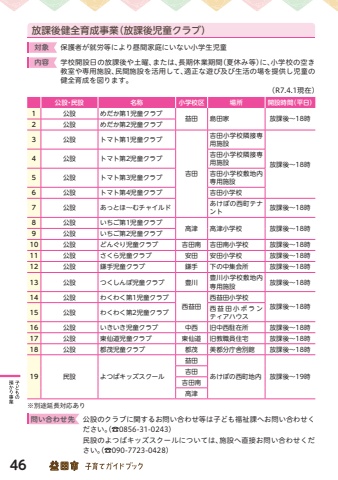 %u5bfe%u8c61%u4fdd%u8b77%u8005%u304c%u5c31%u52b4%u7b49%u306b%u3088%u308a%u663c%u9593%u5bb6%u5ead%u306b%u3044%u306a%u3044%u5c0f%u5b66%u751f%u5150%u7ae5%u5b66%u6821%u958b%u8a2d%u65e5%u306e%u653e%u8ab2%u5f8c%u3084%u571f%u66dc%u3001%u307e%u305f%u306f%u3001%u9577%u671f%u4f11%u696d%u671f%u9593%uff08%u590f%u4f11%u307f%u7b49%uff09%u306b%u3001%u5c0f%u5b66%u6821%u306e%u7a7a%u304d%u6559%u5ba4%u3084%u5c02%u7528%u65bd%u8a2d%u3001%u6c11%u9593%u65bd%u8a2d%u3092%u6d3b%u7528%u3057%u3066%u3001%u9069%u6b63%u306a%u904a%u3073%u53ca%u3073%u751f%u6d3b%u306e%u5834%u3092%u63d0%u4f9b%u3057%u5150%u7ae5%u306e%u5065%u5168%u80b2%u6210%u3092%u56f3%u308a%u307e%u3059%u3002%u5185%u5bb9%u516c%u8a2d%u30fb%u6c11%u8a2d%u540d%u79f0%u5c0f%u5b66%u6821%u533a%u5834%u6240%u958b%u8a2d%u6642%u9593%uff08%u5e73%u65e5%uff091%u516c%u8a2d%u3081%u3060%u304b%u7b2c1%u5150%u7ae5%u30af%u30e9%u30d6%u76ca%u7530%u5cf6%u7530%u5bb6%u653e%u8ab2%u5f8c%uff5e18%u66422%u516c%u8a2d%u3081%u3060%u304b%u7b2c2%u5150%u7ae5%u30af%u30e9%u30d63%u516c%u8a2d%u30c8%u30de%u30c8%u7b2c1%u5150%u7ae5%u30af%u30e9%u30d6%u5409%u7530%u5409%u7530%u5c0f%u5b66%u6821%u96a3%u63a5%u5c02%u7528%u65bd%u8a2d%u653e%u8ab2%u5f8c%uff5e18%u66424%u516c%u8a2d%u30c8%u30de%u30c8%u7b2c2%u5150%u7ae5%u30af%u30e9%u30d6%u5409%u7530%u5c0f%u5b66%u6821%u96a3%u63a5%u5c02%u7528%u65bd%u8a2d5%u516c%u8a2d%u30c8%u30de%u30c8%u7b2c3%u5150%u7ae5%u30af%u30e9%u30d6%u5409%u7530%u5c0f%u5b66%u6821%u6577%u5730%u5185%u5c02%u7528%u65bd%u8a2d6%u516c%u8a2d%u30c8%u30de%u30c8%u7b2c4%u5150%u7ae5%u30af%u30e9%u30d6%u5409%u7530%u5c0f%u5b66%u68217%u516c%u8a2d%u3042%u3063%u3068%u307b%uff5e%u3080%u30c1%u30e3%u30a4%u30eb%u30c9%u3042%u3051%u307c%u306e%u897f%u753a%u30c6%u30ca%u30f3%u30c8%u653e%u8ab2%u5f8c%uff5e18%u66428%u516c%u8a2d%u3044%u3061%u3054%u7b2c1%u5150%u7ae5%u30af%u30e9%u30d6%u9ad8%u6d25%u9ad8%u6d25%u5c0f%u5b66%u6821%u653e%u8ab2%u5f8c%uff5e18%u66429%u516c%u8a2d%u3044%u3061%u3054%u7b2c2%u5150%u7ae5%u30af%u30e9%u30d610%u516c%u8a2d%u3069%u3093%u3050%u308a%u5150%u7ae5%u30af%u30e9%u30d6%u5409%u7530%u5357%u5409%u7530%u5357%u5c0f%u5b66%u6821%u653e%u8ab2%u5f8c%uff5e18%u664211%u516c%u8a2d%u3055%u304f%u3089%u5150%u7ae5%u30af%u30e9%u30d6%u5b89%u7530%u5b89%u7530%u5c0f%u5b66%u6821%u653e%u8ab2%u5f8c%uff5e18%u664212%u516c%u8a2d%u938c%u624b%u5150%u7ae5%u30af%u30e9%u30d6%u938c%u624b%u4e0b%u306e%u4e2d%u96c6%u4f1a%u6240%u653e%u8ab2%u5f8c%uff5e18%u664213%u516c%u8a2d%u3064%u304f%u3057%u3093%u307c%u5150%u7ae5%u30af%u30e9%u30d6%u8c4a%u5ddd%u8c4a%u5ddd%u5c0f%u5b66%u6821%u6577%u5730%u5185%u5c02%u7528%u65bd%u8a2d%u653e%u8ab2%u5f8c%uff5e18%u664214%u516c%u8a2d%u308f%u304f%u308f%u304f%u7b2c1%u5150%u7ae5%u30af%u30e9%u30d6%u897f%u76ca%u7530%u897f%u76ca%u7530%u5c0f%u5b66%u6821%u653e%u8ab2%u5f8c%uff5e18%u664215%u516c%u8a2d%u308f%u304f%u308f%u304f%u7b2c2%u5150%u7ae5%u30af%u30e9%u30d6%u897f%u76ca%u7530%u5c0f%u30dc%u30e9%u30f3%u30c6%u30a3%u30a2%u30cf%u30a6%u30b916%u516c%u8a2d%u3044%u304d%u3044%u304d%u5150%u7ae5%u30af%u30e9%u30d6%u4e2d%u897f%u65e7%u4e2d%u897f%u99d0%u5728%u6240%u653e%u8ab2%u5f8c%uff5e18%u664217%u516c%u8a2d%u6771%u4ed9%u9053%u5150%u7ae5%u30af%u30e9%u30d6%u6771%u4ed9%u9053%u65e7%u6559%u8077%u54e1%u4f4f%u5b85%u653e%u8ab2%u5f8c%uff5e18%u664218%u516c%u8a2d%u90fd%u8302%u5150%u7ae5%u30af%u30e9%u30d6%u90fd%u8302%u7f8e%u90fd%u5206%u5e81%u820e%u5225%u9928%u653e%u8ab2%u5f8c%uff5e18%u664219%u6c11%u8a2d%u3088%u3064%u3070%u30ad%u30c3%u30ba%u30b9%u30af%u30fc%u30eb%u76ca%u7530%u3042%u3051%u307c%u306e%u897f%u753a%u5730%u5185%u653e%u8ab2%u5f8c%uff5e19%u6642%u5409%u7530%u5409%u7530%u5357%u9ad8%u6d25(R7.4.1%u73fe%u5728%uff09%u516c%u8a2d%u306e%u30af%u30e9%u30d6%u306b%u95a2%u3059%u308b%u304a%u554f%u3044%u5408%u308f%u305b%u7b49%u306f%u5b50%u3069%u3082%u798f%u7949%u8ab2%u3078%u304a%u554f%u3044%u5408%u308f%u305b%u304f%u3060%u3055%u3044%u3002%uff08%u260e0856-31-0243%uff09%u6c11%u8a2d%u306e%u3088%u3064%u3070%u30ad%u30c3%u30ba%u30b9%u30af%u30fc%u30eb%u306b%u3064%u3044%u3066%u306f%u3001%u65bd%u8a2d%u3078%u76f4%u63a5%u304a%u554f%u3044%u5408%u308f%u305b%u304f%u3060%u3055%u3044%u3002%uff08%u260e090-7723-0428%uff09%u554f%u3044%u5408%u308f%u305b%u5148%u203b%u5225%u9014%u5ef6%u9577%u5bfe%u5fdc%u3042%u308a46
