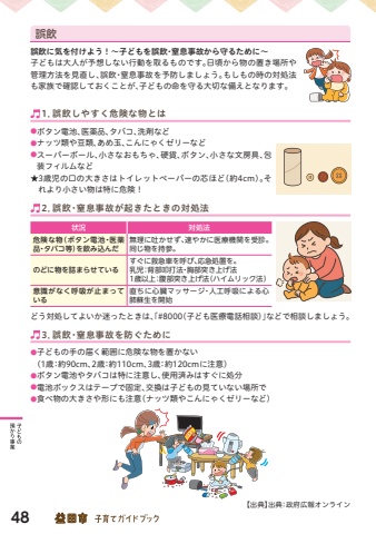 %u3010%u51fa%u5178%u3011%u51fa%u5178%uff1a%u653f%u5e9c%u5e83%u5831%u30aa%u30f3%u30e9%u30a4%u30f3%u25cf %u5b50%u3069%u3082%u306e%u624b%u306e%u5c4a%u304f%u7bc4%u56f2%u306b%u5371%u967a%u306a%u7269%u3092%u7f6e%u304b%u306a%u3044 %uff081%u6b73%uff1a%u7d0490cm%u30012%u6b73%uff1a%u7d04110cm%u30013%u6b73%uff1a%u7d04120cm%u306b%u6ce8%u610f%uff09%u25cf %u30dc%u30bf%u30f3%u96fb%u6c60%u3084%u30bf%u30d0%u30b3%u306f%u7279%u306b%u6ce8%u610f%u3057%u3001%u4f7f%u7528%u6e08%u307f%u306f%u3059%u3050%u306b%u51e6%u5206%u25cf %u96fb%u6c60%u30dc%u30c3%u30af%u30b9%u306f%u30c6%u30fc%u30d7%u3067%u56fa%u5b9a%u3001%u4ea4%u63db%u306f%u5b50%u3069%u3082%u306e%u898b%u3066%u3044%u306a%u3044%u5834%u6240%u3067%u25cf %u98df%u3079%u7269%u306e%u5927%u304d%u3055%u3084%u5f62%u306b%u3082%u6ce8%u610f%uff08%u30ca%u30c3%u30c4%u985e%u3084%u3053%u3093%u306b%u3083%u304f%u30bc%u30ea%u30fc%u306a%u3069%uff09 3%uff0e%u8aa4%u98f2%u30fb%u7a92%u606f%u4e8b%u6545%u3092%u9632%u3050%u305f%u3081%u306b%u72b6%u6cc1%u5bfe%u51e6%u6cd5%u5371%u967a%u306a%u7269%uff08%u30dc%u30bf%u30f3%u96fb%u6c60%u30fb%u533b%u85ac%u54c1%u30fb%u30bf%u30d0%u30b3%u7b49%uff09%u3092%u98f2%u307f%u8fbc%u3093%u3060%u7121%u7406%u306b%u5410%u304b%u305b%u305a%u3001%u901f%u3084%u304b%u306b%u533b%u7642%u6a5f%u95a2%u3092%u53d7%u8a3a%u3002%u540c%u3058%u7269%u3092%u6301%u53c2%u3002%u306e%u3069%u306b%u7269%u3092%u8a70%u307e%u3089%u305b%u3066%u3044%u308b%u3059%u3050%u306b%u6551%u6025%u8eca%u3092%u547c%u3073%u3001%u5fdc%u6025%u51e6%u7f6e%u3092%u3002%u4e73%u5150%uff1a%u80cc%u90e8%u53e9%u6253%u6cd5%u30fb%u80f8%u90e8%u7a81%u304d%u4e0a%u3052%u6cd51%u6b73%u4ee5%u4e0a%uff1a%u8179%u90e8%u7a81%u304d%u4e0a%u3052%u6cd5%uff08%u30cf%u30a4%u30e0%u30ea%u30c3%u30af%u6cd5%uff09%u610f%u8b58%u304c%u306a%u304f%u547c%u5438%u304c%u6b62%u307e%u3063%u3066%u3044%u308b%u76f4%u3061%u306b%u5fc3%u81d3%u30de%u30c3%u30b5%u30fc%u30b8%u30fb%u4eba%u5de5%u547c%u5438%u306b%u3088%u308b%u5fc3%u80ba%u8607%u751f%u3092%u958b%u59cb 2%uff0e%u8aa4%u98f2%u30fb%u7a92%u606f%u4e8b%u6545%u304c%u8d77%u304d%u305f%u3068%u304d%u306e%u5bfe%u51e6%u6cd5%u3069%u3046%u5bfe%u51e6%u3057%u3066%u3088%u3044%u304b%u8ff7%u3063%u305f%u3068%u304d%u306f%u3001%u300c#8000%uff08%u5b50%u3069%u3082%u533b%u7642%u96fb%u8a71%u76f8%u8ac7%uff09%u300d%u306a%u3069%u3067%u76f8%u8ac7%u3057%u307e%u3057%u3087%u3046%u3002%u8aa4%u98f2%u306b%u6c17%u3092%u4ed8%u3051%u3088%u3046%uff01%uff5e%u5b50%u3069%u3082%u3092%u8aa4%u98f2%u30fb%u7a92%u606f%u4e8b%u6545%u304b%u3089%u5b88%u308b%u305f%u3081%u306b%uff5e%u5b50%u3069%u3082%u306f%u5927%u4eba%u304c%u4e88%u60f3%u3057%u306a%u3044%u884c%u52d5%u3092%u53d6%u308b%u3082%u306e%u3067%u3059%u3002%u65e5%u9803%u304b%u3089%u7269%u306e%u7f6e%u304d%u5834%u6240%u3084%u7ba1%u7406%u65b9%u6cd5%u3092%u898b%u76f4%u3057%u3001%u8aa4%u98f2%u30fb%u7a92%u606f%u4e8b%u6545%u3092%u4e88%u9632%u3057%u307e%u3057%u3087%u3046%u3002%u3082%u3057%u3082%u306e%u6642%u306e%u5bfe%u51e6%u6cd5%u3082%u5bb6%u65cf%u3067%u78ba%u8a8d%u3057%u3066%u304a%u304f%u3053%u3068%u304c%u3001%u5b50%u3069%u3082%u306e%u547d%u3092%u5b88%u308b%u5927%u5207%u306a%u5099%u3048%u3068%u306a%u308a%u307e%u3059%u3002%u25cf %u30dc%u30bf%u30f3%u96fb%u6c60%u3001%u533b%u85ac%u54c1%u3001%u30bf%u30d0%u30b3%u3001%u6d17%u5264%u306a%u3069%u25cf %u30ca%u30c3%u30c4%u985e%u3084%u8c46%u985e%u3001%u3042%u3081%u7389%u3001%u3053%u3093%u306b%u3083%u304f%u30bc%u30ea%u30fc%u306a%u3069%u25cf %u30b9%u30fc%u30d1%u30fc%u30dc%u30fc%u30eb%u3001%u5c0f%u3055%u306a%u304a%u3082%u3061%u3083%u3001%u786c%u8ca8%u3001%u30dc%u30bf%u30f3%u3001%u5c0f%u3055%u306a%u6587%u623f%u5177%u3001%u5305%u88c5%u30d5%u30a3%u30eb%u30e0%u306a%u3069%u2605 3%u6b73%u5150%u306e%u53e3%u306e%u5927%u304d%u3055%u306f%u30c8%u30a4%u30ec%u30c3%u30c8%u30da%u30fc%u30d1%u30fc%u306e%u82af%u307b%u3069%uff08%u7d044cm%uff09%u3002%u305d%u308c%u3088%u308a%u5c0f%u3055%u3044%u7269%u306f%u7279%u306b%u5371%u967a%uff01 1%uff0e%u8aa4%u98f2%u3057%u3084%u3059%u304f%u5371%u967a%u306a%u7269%u3068%u306f48